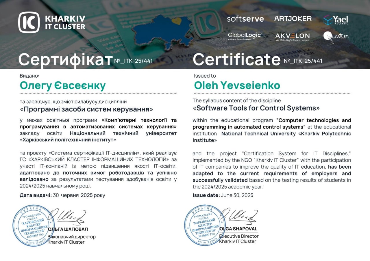 On June 30, 2025, a faculty member of our department, Oleh Mykolaiovych Yevseienko, received a certificate confirming that the content of the course “Software Tools for Control Systems” meets the criteria of the “IT Disciplines Certification System” project, implemented by Kharkiv IT Cluster.