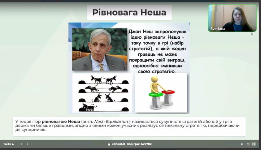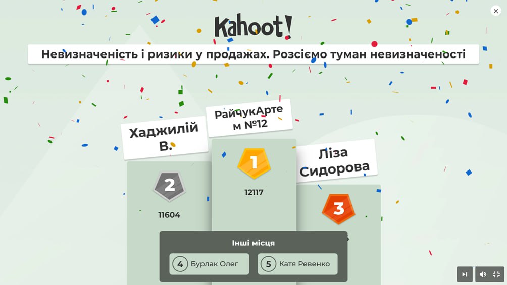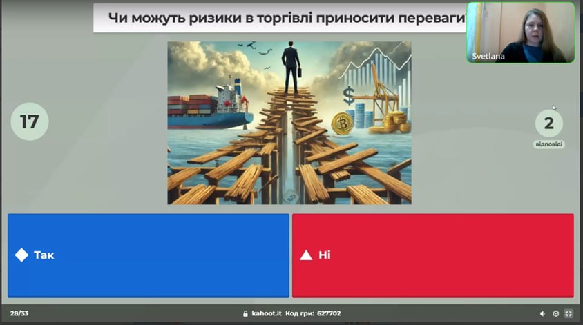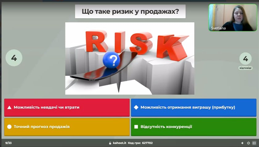 25 березня о 16.00 в рамках Канікул із Політехом, у онлайн-форматі відбулася вікторина-kahoot «Невизначеність і ризики у продажах. Розсіємо туман невизначеності» від кафедри підприємництва, торгівлі і логістики НТУ «ХПІ». У грі прийняло участь 9 учасників. Доцент кафедри підприємництва, торгівлі і логістики НТУ «ХПІ», к.е.н., доцент Світлана Степуріна провела вікторину-kahoot, де учасники відповідали на різні питання, пов’язані з невизначеністю, ризиками у торгівлі і логістиці та теорією ігор. Наприкінці зустрічі Світлана Степуріна ознайомила учасників із освітніми програмами кафедри підприємництва, торгівлі і логістики НТУ “ХПІ”.