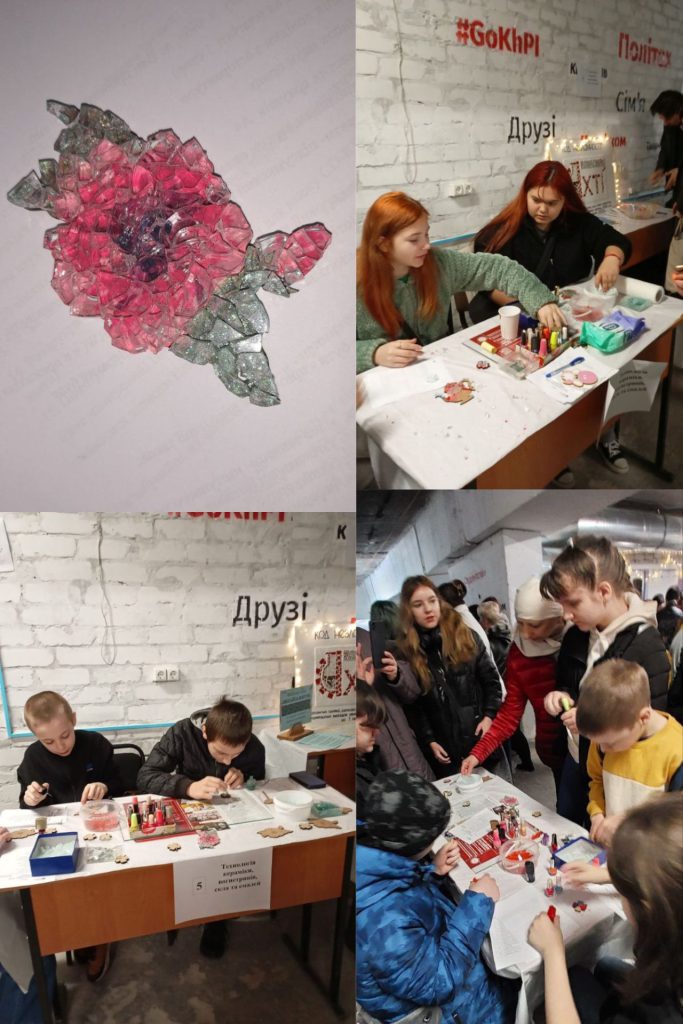 Для ознайомлення з кафедрами ІХТІ учасники офлайн-зустрічі мали пройти квест, виконуючі певні завдання. Наша кафедра запропонувала дітям майстер-клас з скляної мозаїки та відповісти на питання хімічної вікторини.