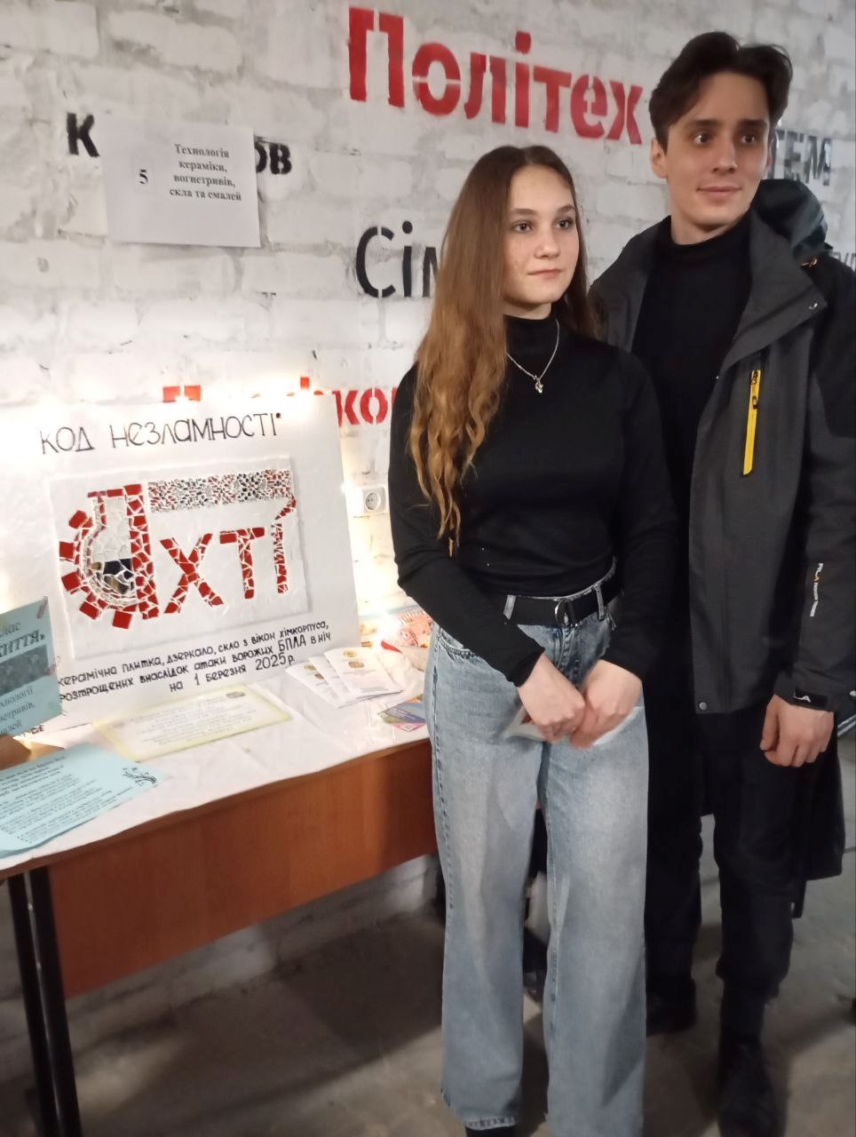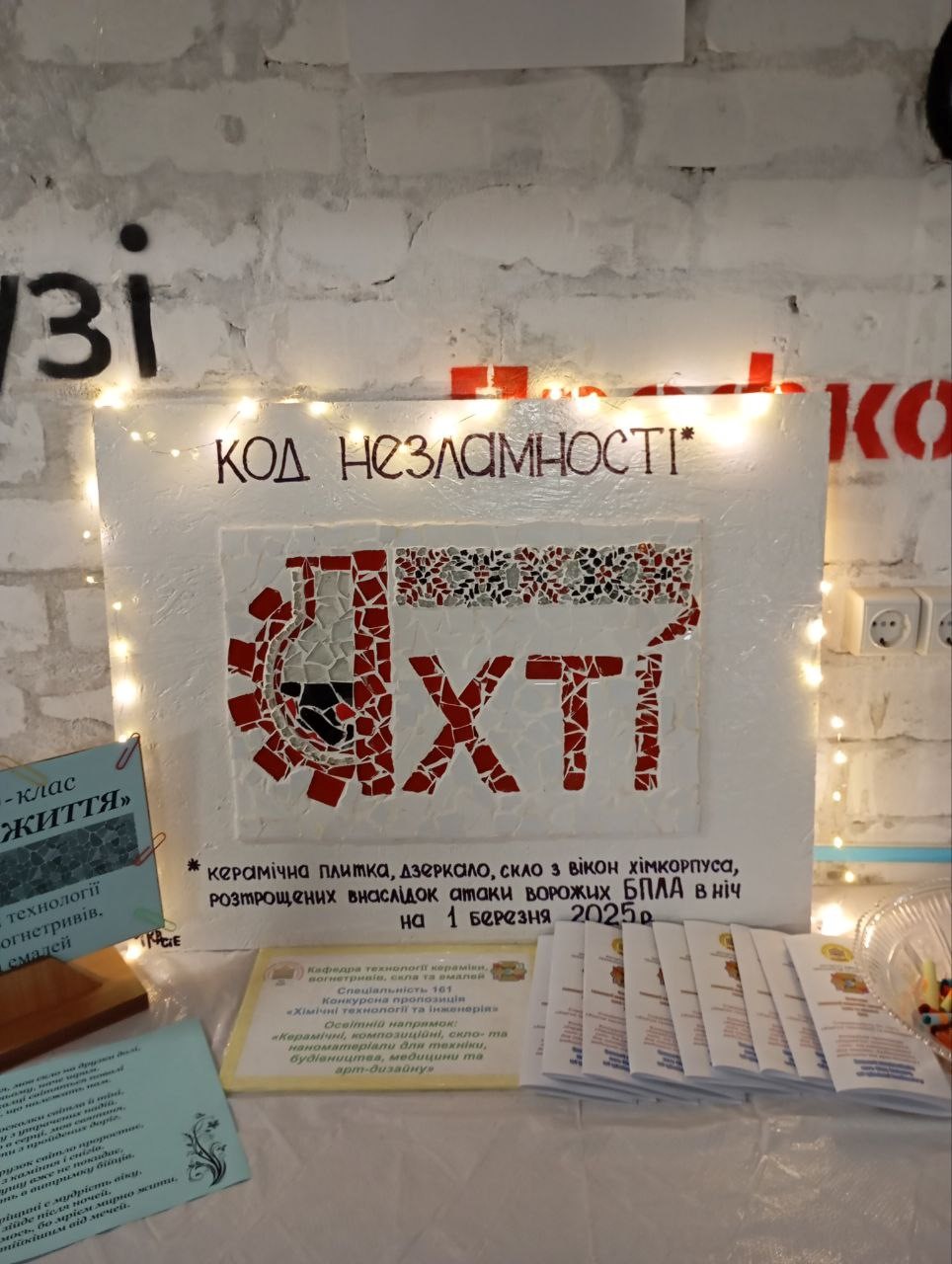 Офлайн-подію відвідали дуже багато школярів, які могли ознайомитися з освітніми напрямками нашого інституту, студентами і викладачами. Наша кафедра технології кераміки, вогнетривів, скла та емалей була представлена завідувачкою кафедри Оленою Федоренко та професорками кафедри Оксаною Борисенко та Вікторією Тараненковою. Ми представили власноруч виготовлену мозаїку «Код незламності», яка створена з уламків керамічної плитки та скла, що залишилися після прильоту ворожих БПЛА по корпусах НТУ «ХПІ».