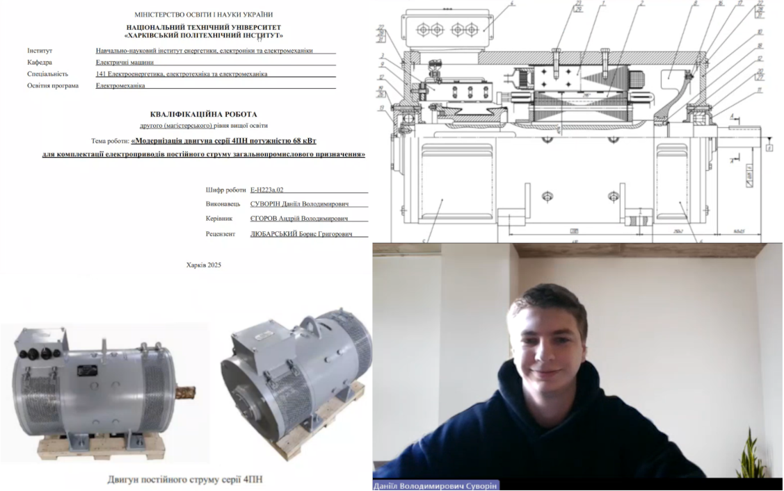 | Владислав КОЗАКОВ, група Е-М222за «Модернізація двигуна постійного струму серії 4ПН225 потужністю 48 кВт для привода промислових агрегатів» Керівник: доцент Андрй ЄГОРОВ. |