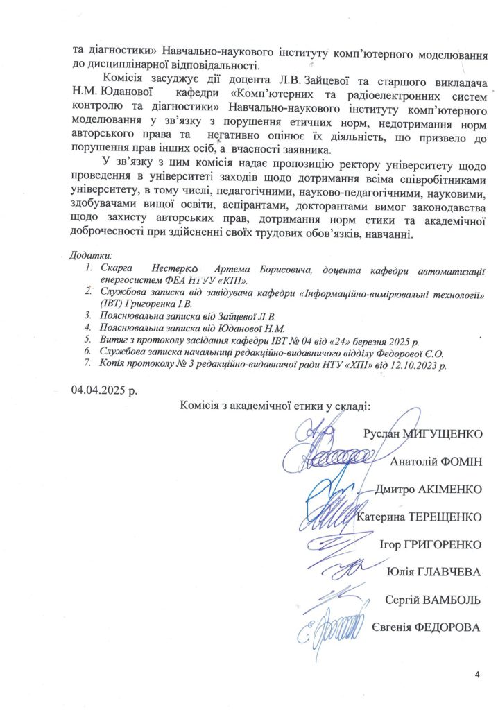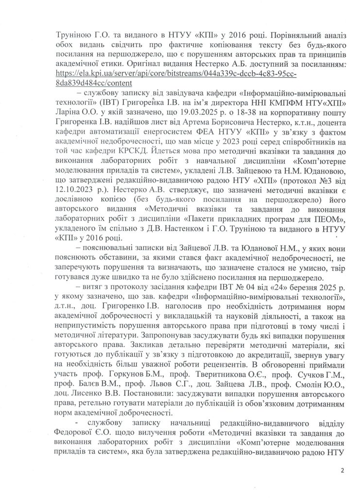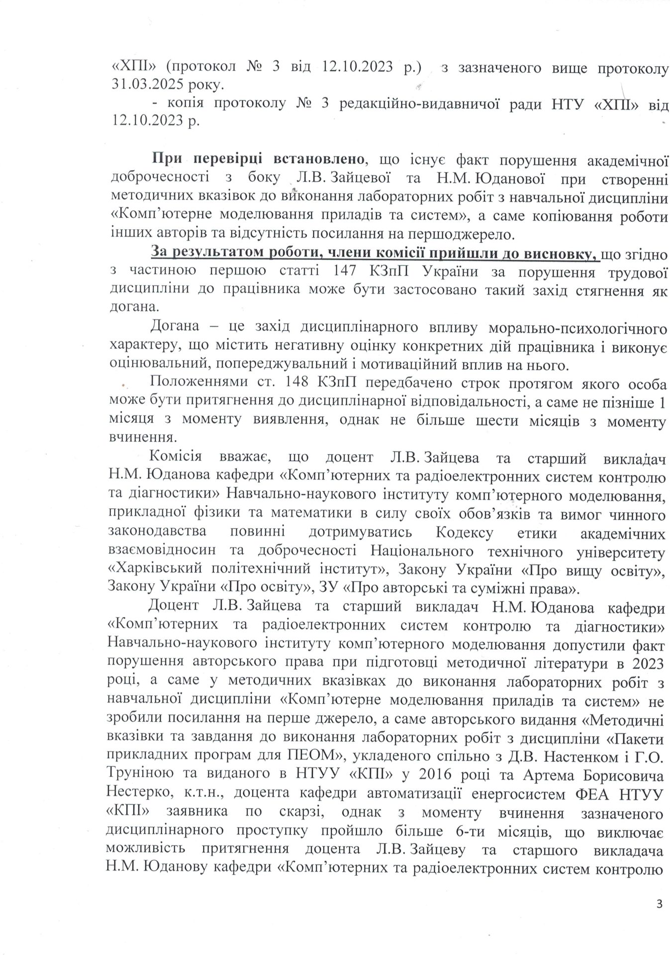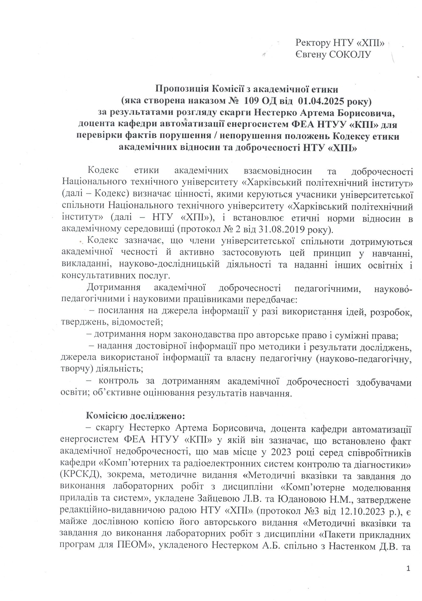 Пропозиція комісії з академічної етики НТУ “ХПІ” Пропозиція Комісії з академічної етики для ректора НТУ “ХПІ” Євгена Сокола щодо розгляду скарги Нестерко А.Б., доцента каф. ФЕА НТУУ “КПІ” для перевірки фактів порушення положень Кодексу етики академічних відносин та доброчесності НТУ “ХПІ”.
