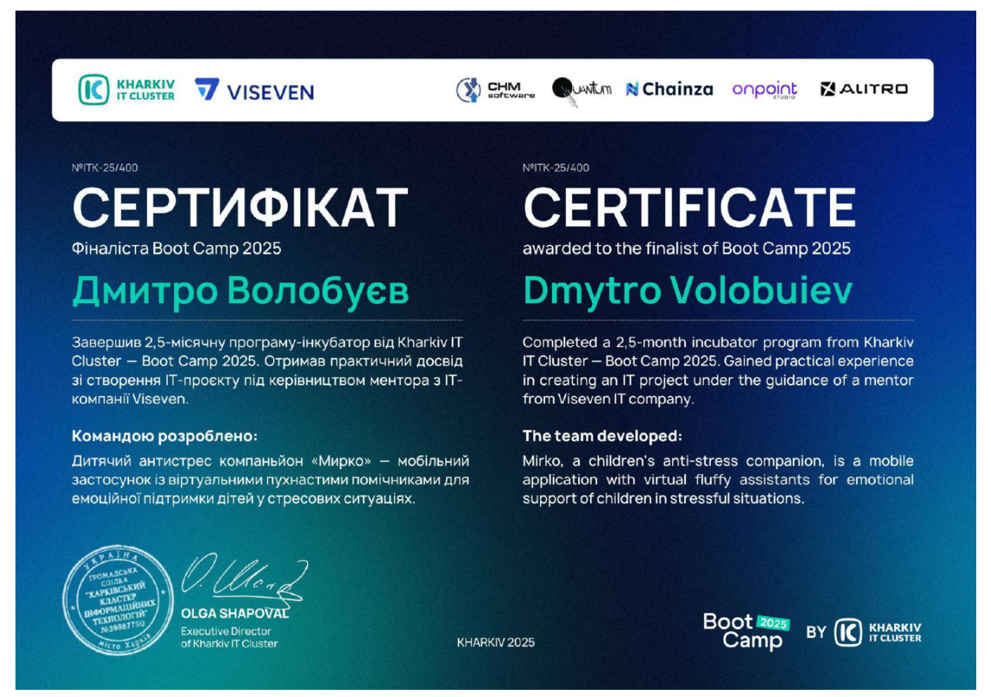 Студенти Ангеліна Данілова, студентка групи КН-322а кафедри управління проєктами в інформаційних технологіях, та Дмитро Волобуєв, студент групи КН-322б кафедри системного аналізу та інформаційно-аналітичних технологій, отримали сертифікати фіналістів Boot Camp 2025 за участь у команді розробки мобільного антистрес-компаньйона для дітей «Мирко». Вони працювали під менторством Тетяни Нетрибійчук, експертки ІТ-компанії Viseven.