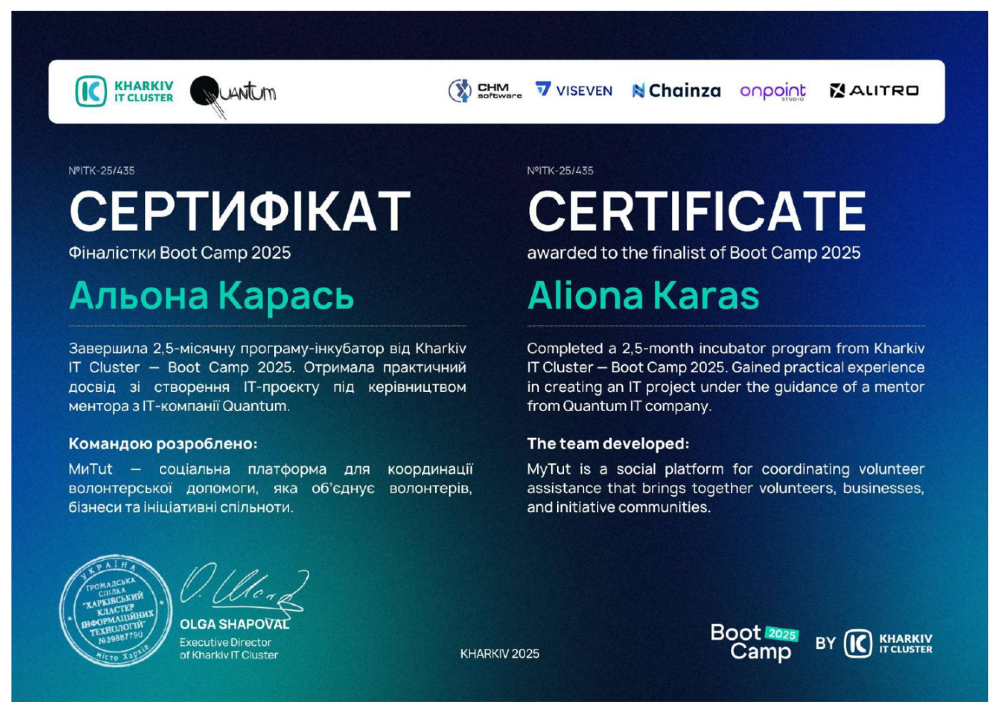 Студентка групи КН-1223а кафедри управління проєктами в інформаційних технологіях Альона Карась отримала сертифікат фіналістки Boot Camp 2025 за реалізацію волонтерського застосунку МиTut у складі команди під менторством Володимира Кузьменка, експерта з ІТ-компанії Quantum. МиTut – це ресурс для підтримки волонтерської діяльності та ефективної взаємодії з бізнесом. Це соціальна платформа, що об’єднує волонтерів, представників бізнесу та всіх, хто прагне допомагати.
