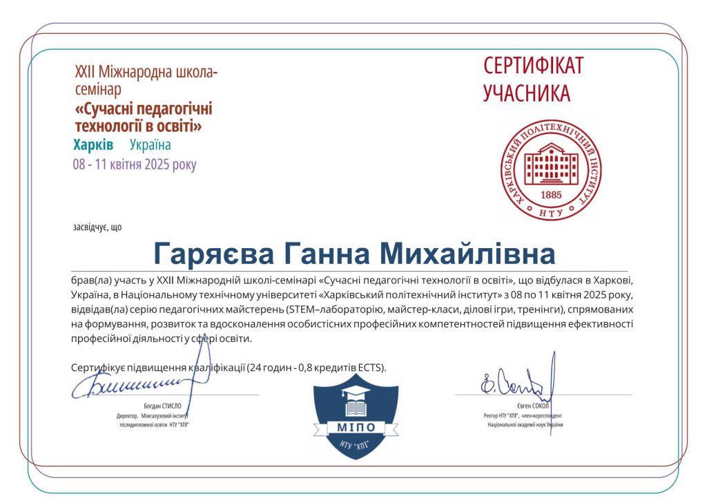 From April 8 to 11, 2025, the INTERNATIONAL SCHOOL-SEMINAR “MODERN PEDAGOGICAL TECHNOLOGIES IN EDUCATION” was held at NTU “KhPI”.