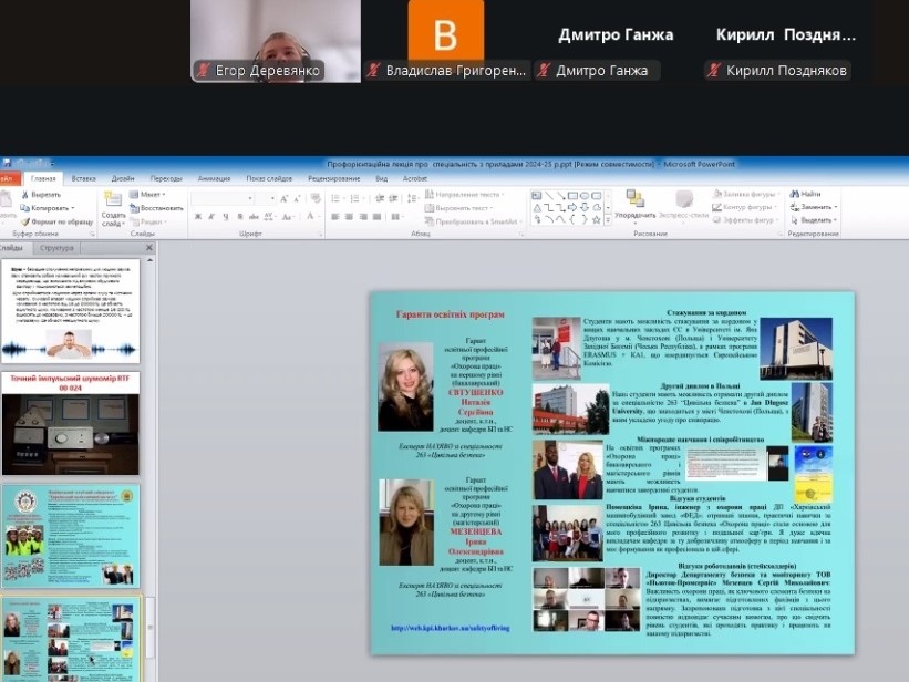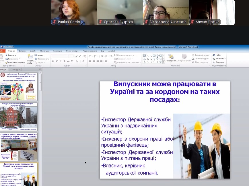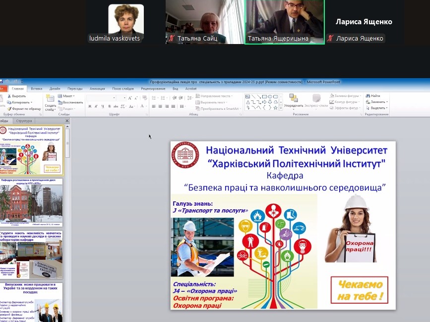 У цьому навчальному році дистанційну профорієнтаційну роботу стосовно вступу на спеціальність J4 «Охорона праці» освітня програма «Охорона праці» розпочато майже з початку навчання школярів, а саме – у вересні. Так, перший дистанційний профорієнтаційний захід було проведено 22 вересня 2025 р. доц. Ящеріциним Є.В. з учнями Харківського ліцею №143.
