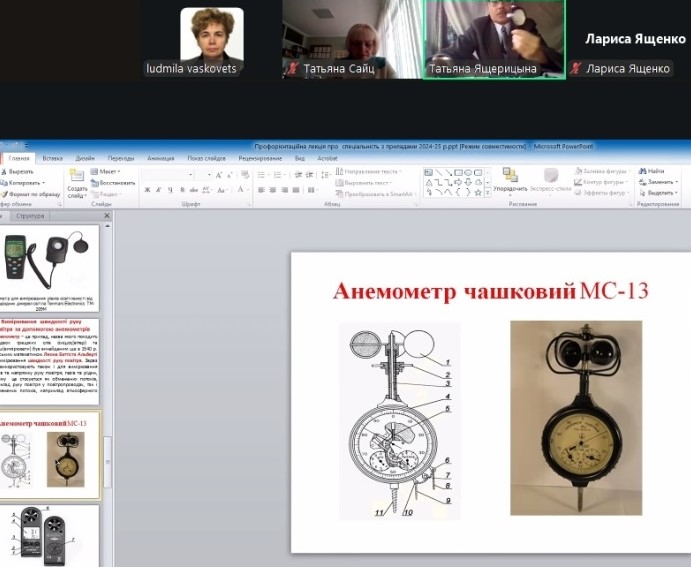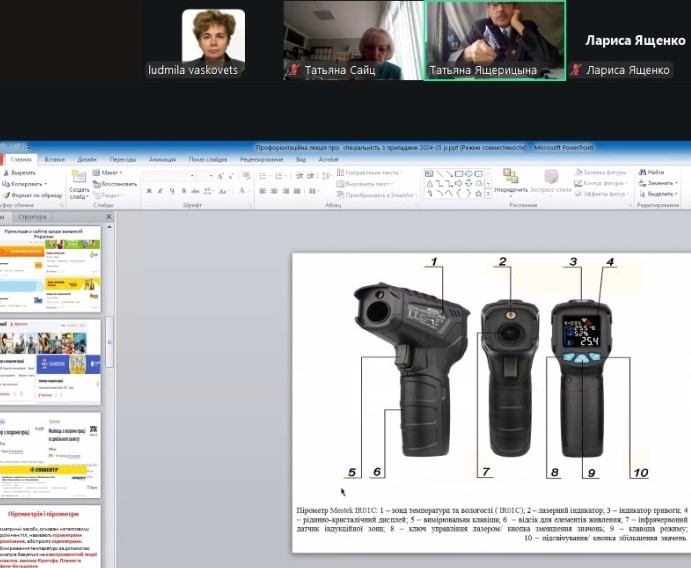 Виступаючи перед учнями, доц. Ящеріцин Є.В. органічно поєднував демонстрацію презентації з інформацією про спеціальність з проведенням показових вимірювань приладами учбової лабораторії кафедри «Безпека праці та навколишнього середовища» деяких параметрів шкідливих та небезпечних виробничих факторів, а саме, температуру – пірометром Mestek IR01C та швидкості руху повітря – анемометрами крильчастим ВТМЕТЕR ВТ-816В і чашковим МС-13.