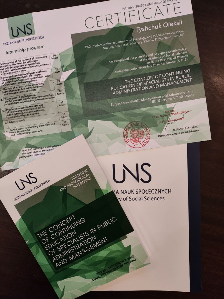 За підтримки Громадської організації «Академія соціальних трансформацій та інноваційного управління» (м. Харків, Україна) аспірант кафедри соціології і публічного управління Тищук Олексій (третій рік навчання за спеціальністю «Публічне управління та адміністрування») з липня по вересень 2025 пройшов науково-педагогічне стажування «Концепція неперервної освіти фахівців із публічного управління та адміністрування».