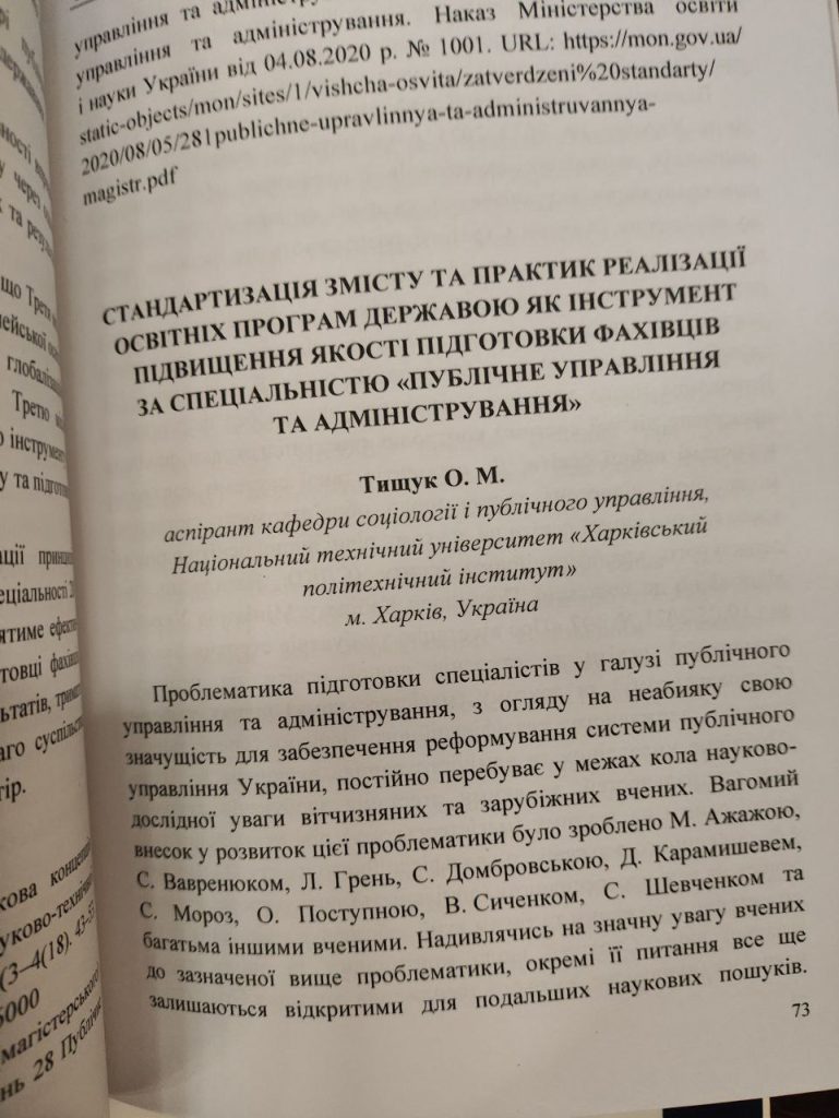 За результатами науково-педагогічного стажування Олексій підготував та захистив роботу «Стандартизація змісту та практик реалізації освітніх програм державою як інструмент підвищення якості підготовки фахівців за спеціальністю «Публічне управління та адміністрування»». Ректор Академії соціальних наук (м. Лодзь, Польща) Dr. Piotr Domżał звернув увагу на високий рівень підготовки аспіранта кафедри соціології і публічного управління Тищука Олексія та його неабияку вмотивованість щодо отримання нових знань.