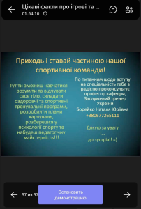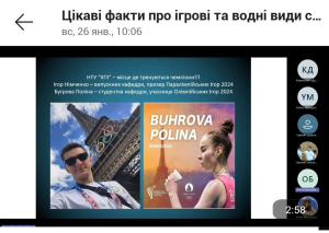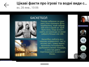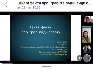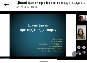 26.01.25 доцентами кафедри фізичного виховання НТУ “ХПІ” Тіняковим Артемом Олександровичем та Білоус Олесею Валеріївною було проведено лекцію для школярів “Цікаві факти про ігрові та водні види спорту”. Учні мали змогу надихнутись на зайняття спортом, поглибити свої знання, поспілкуватись з викладачами ВУЗу щодо вступу на кафедру фізичного виховання НТУ “ХПІ”. Захід було проведено з метою проф.орієнтації, а також поліпшення здоров’я молоді.
