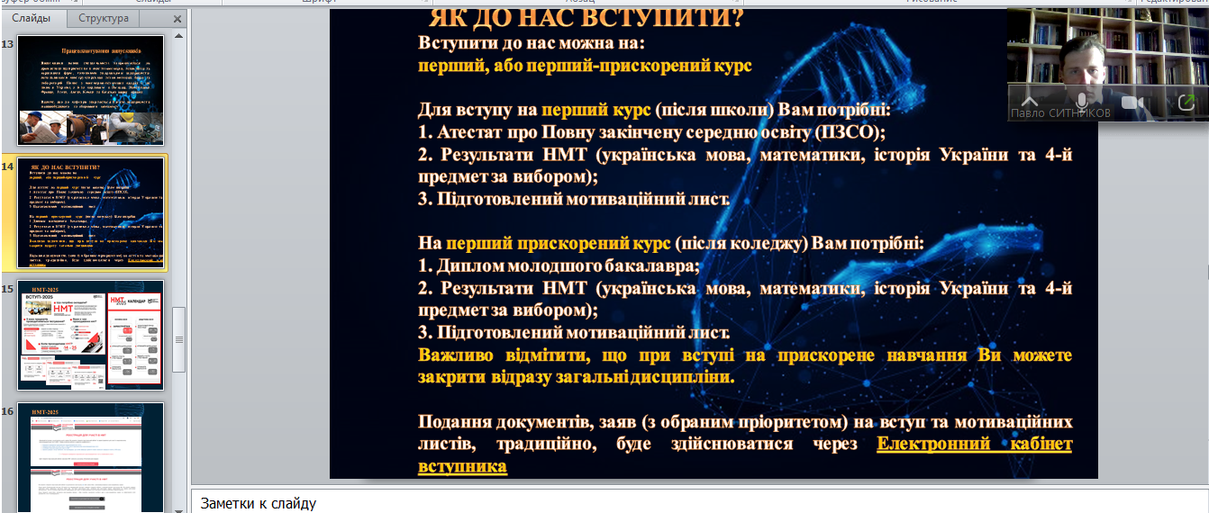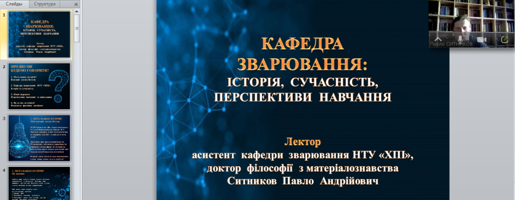 28 грудня 2024 р. Павло Ситников провів онлайн зустріч з представниками закладу, де присутні були ознайомленні з підготовленою презентацією на тему «Кафедра «Зварювання»: історія, сучасність та перспективи навчання».