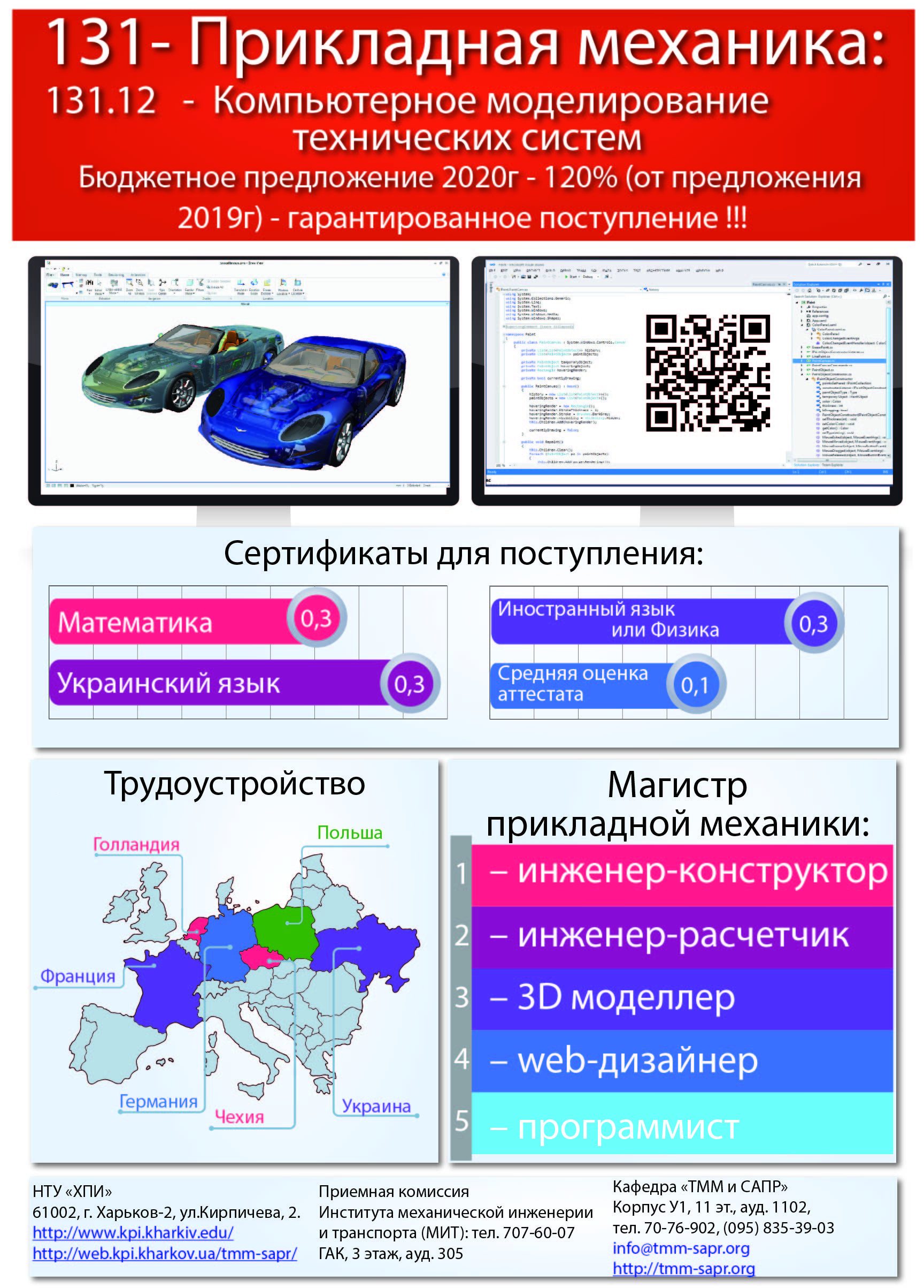 Кафедра: «Теорія і системи автоматизованого проектування механізмів і машин»; адреса: 61002, м. Харків, вул. Кирпичова 2, корпус У2, 2 поверх, ауд. 208 (навпроти ректорського корпусу, над Центральною приймальною комісією); тел. 093-398-33-83 (Viber, Telegram, WhatsApp)