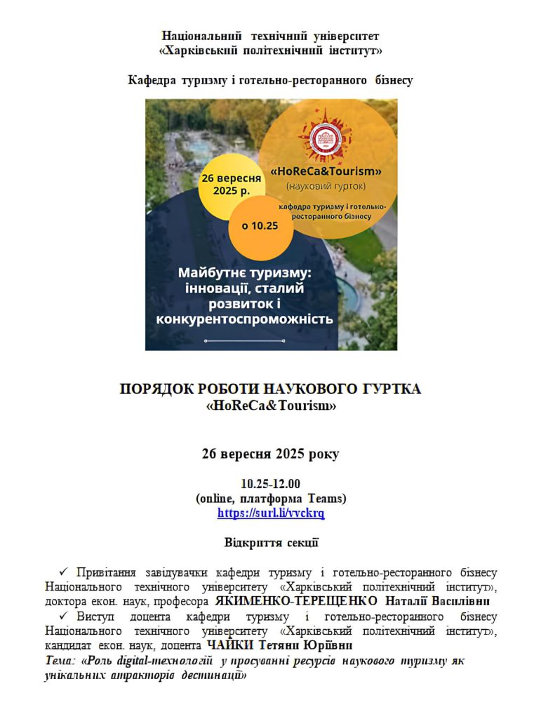 26 вересня 2025 року о 10:25 кафедра туризму і готельно-ресторанного бізнесу запрошує усіх бажаючих на засідання наукового гуртка “HoReCa&Tourism” за темою: