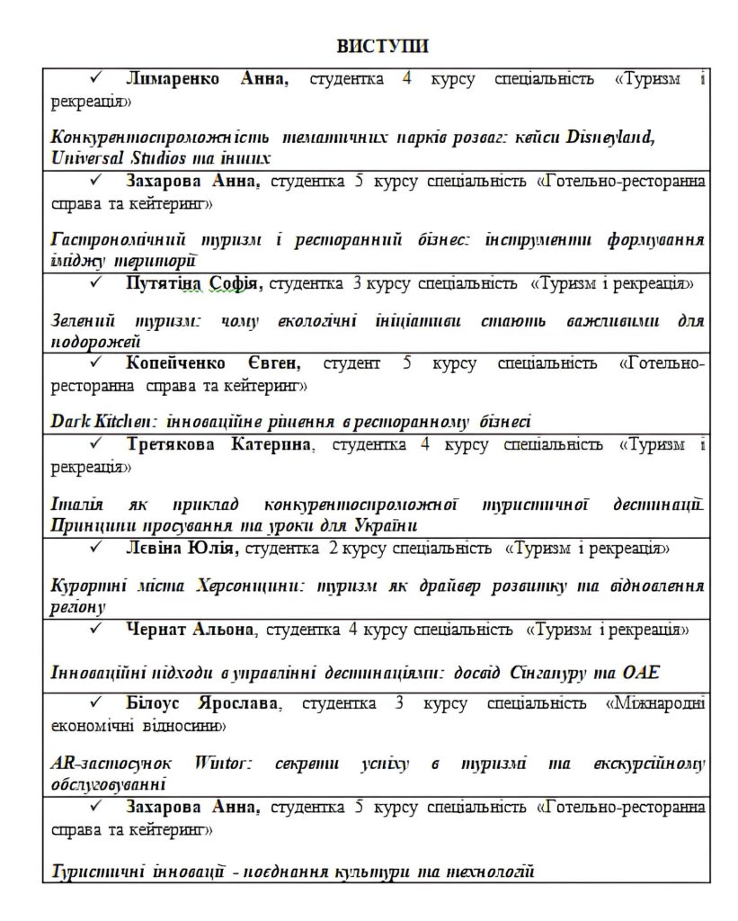 - Захарова Анна, студентка 5 курсу спеціальність «Готельно-ресторанна справа та кейтеринг» Туристичні інновації – поєднання культури та технологій✔️Дискусійна панель: «Яким буде туризм у 2030 році?»