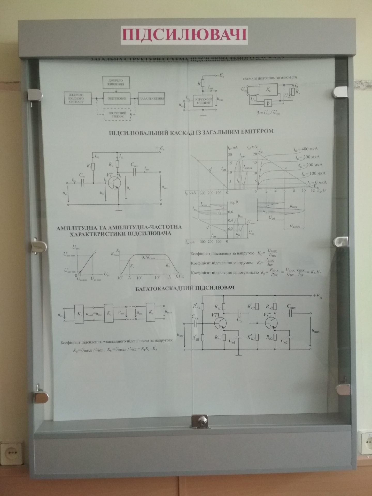 Лабораторні заняття проводяться фронтальним методом, для цього на кафедрі є 14 універсальних стендів з електротехніки, 8 універсальних лабораторних стендів з електроніки і 3 універсальних лабораторних стенди з мікропроцесорної техніки. У коридорі кафедри розміщені 24 інформаційно-довідкових стенди, які представляють по суті стислий конспект лекцій з електротехніки і електроніки.