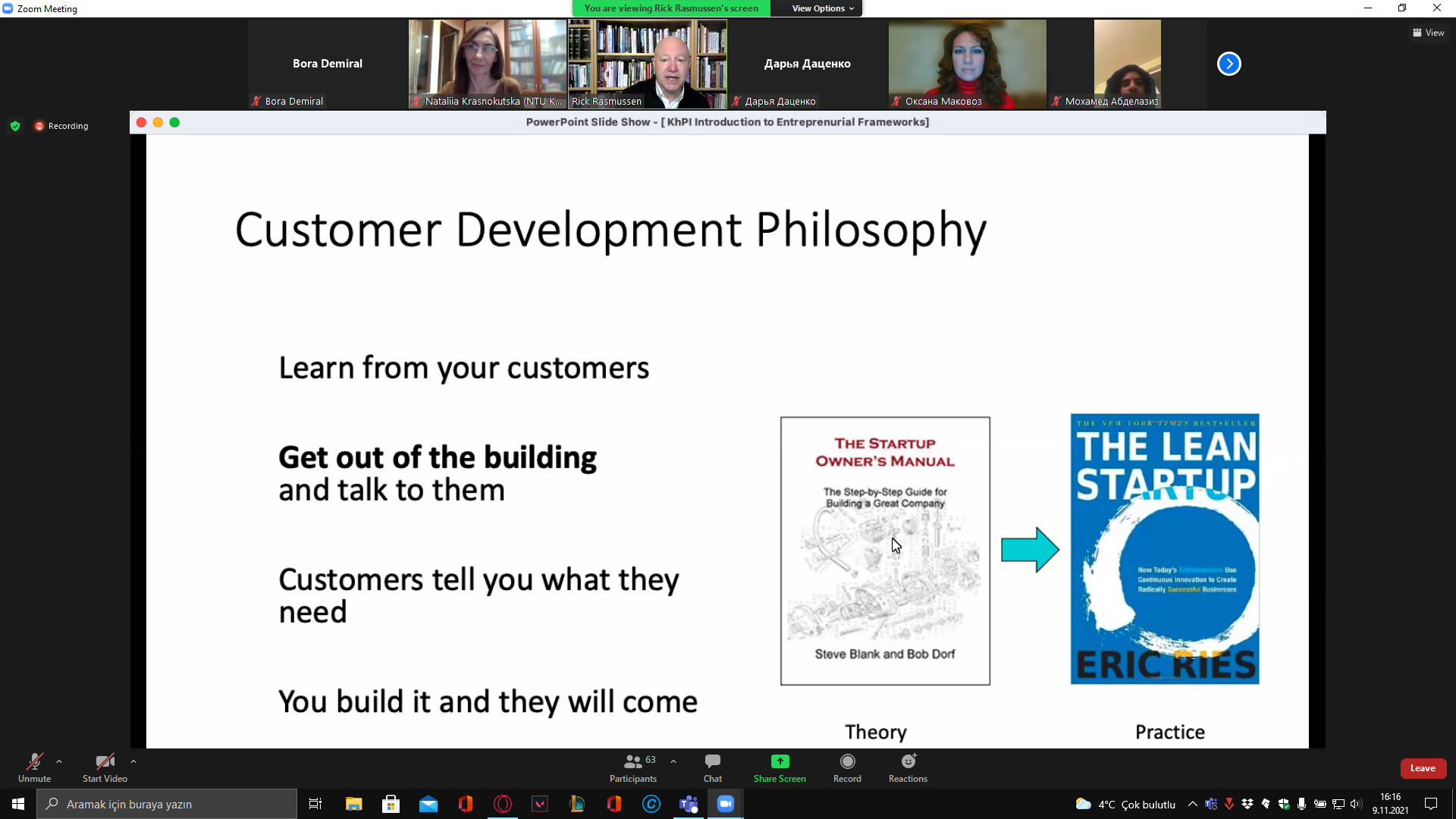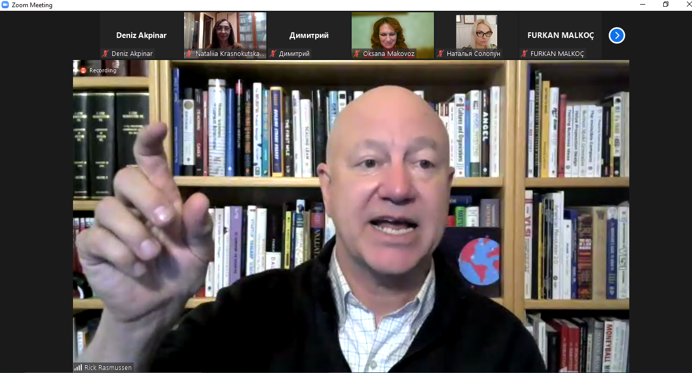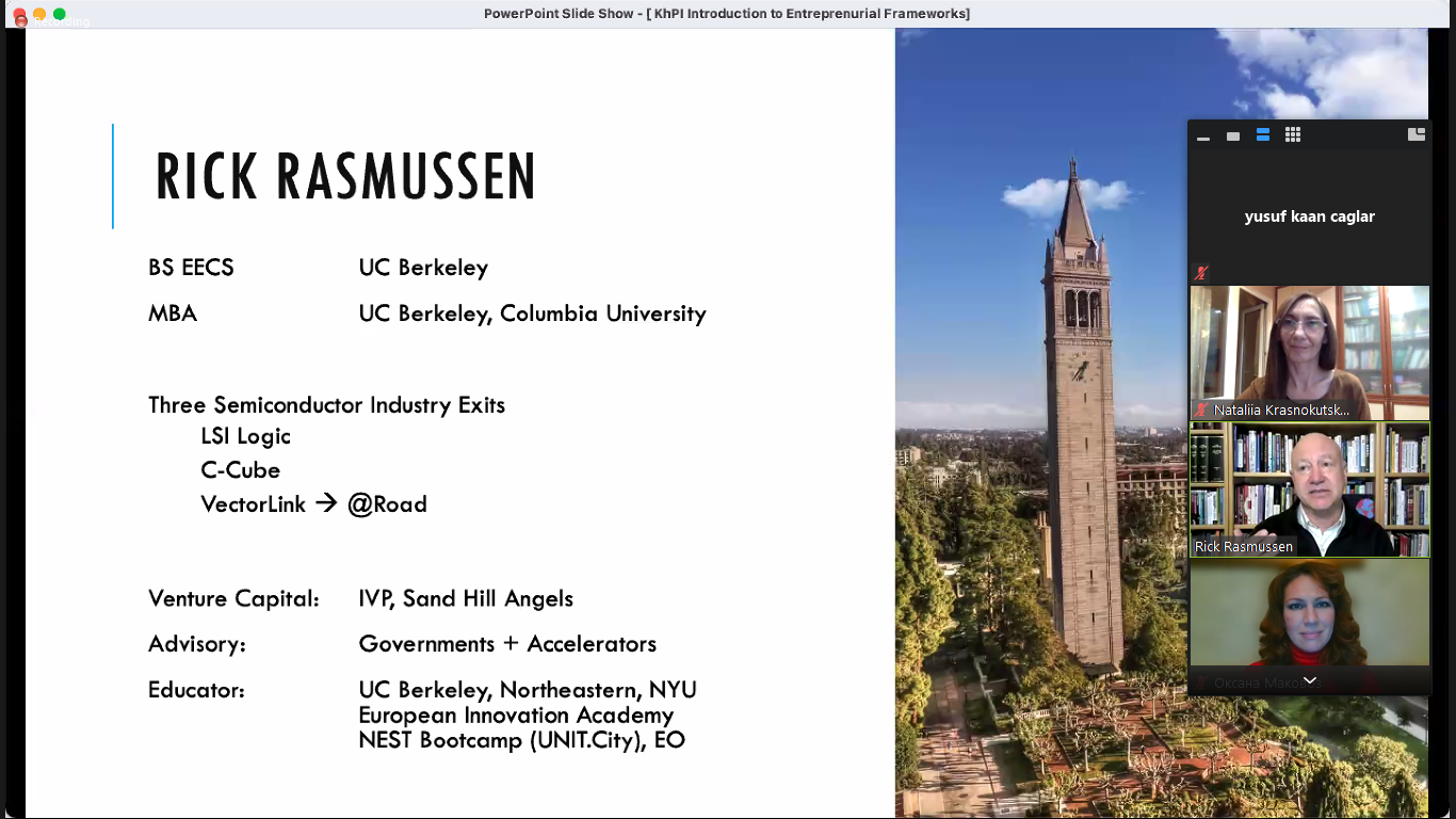 9 листопада о 16:00 Лектор Рік Расмуссен із Каліфорнійського університету Берклі (США) давав лекцiю на базi платформи Zoom. Тема першої лекції — «Introduction to Entrepreneurial Frameworks».Слухачі дізналися про використання на практиці кращих сучасних підходів до «розвитку споживача» (Customer Development) та так званого «дисциплінованого підприємництва» (Disciplined Entrepreneurship), а також історії їх виникнення