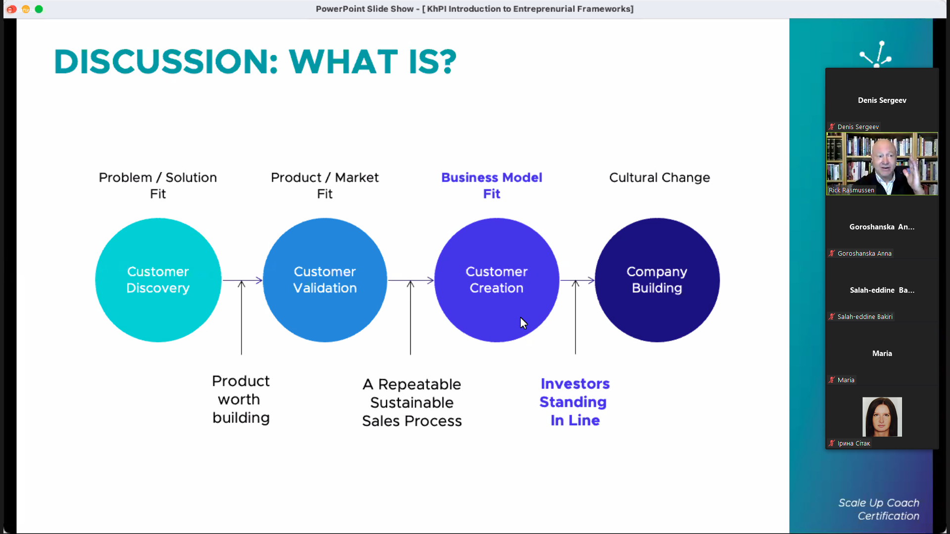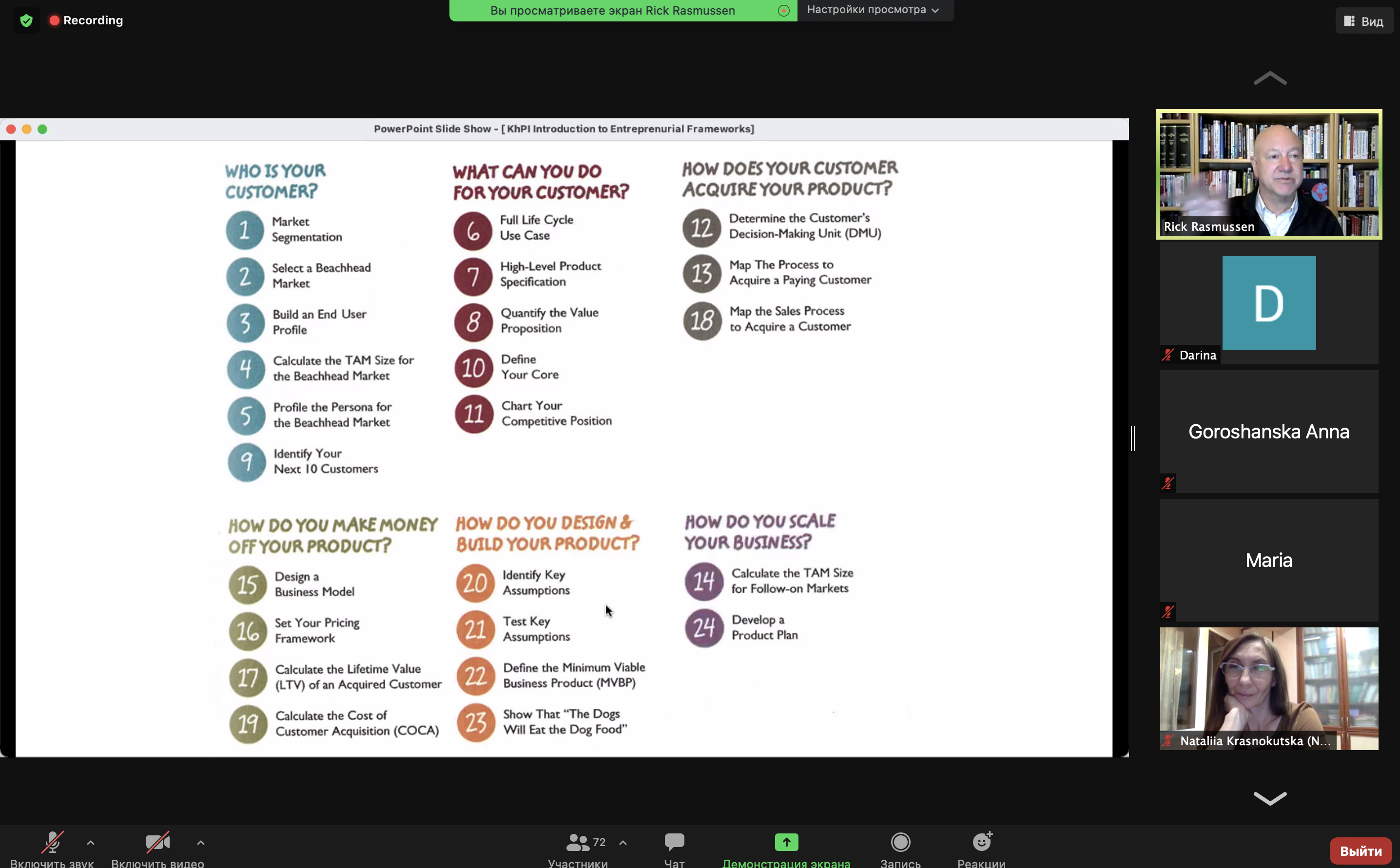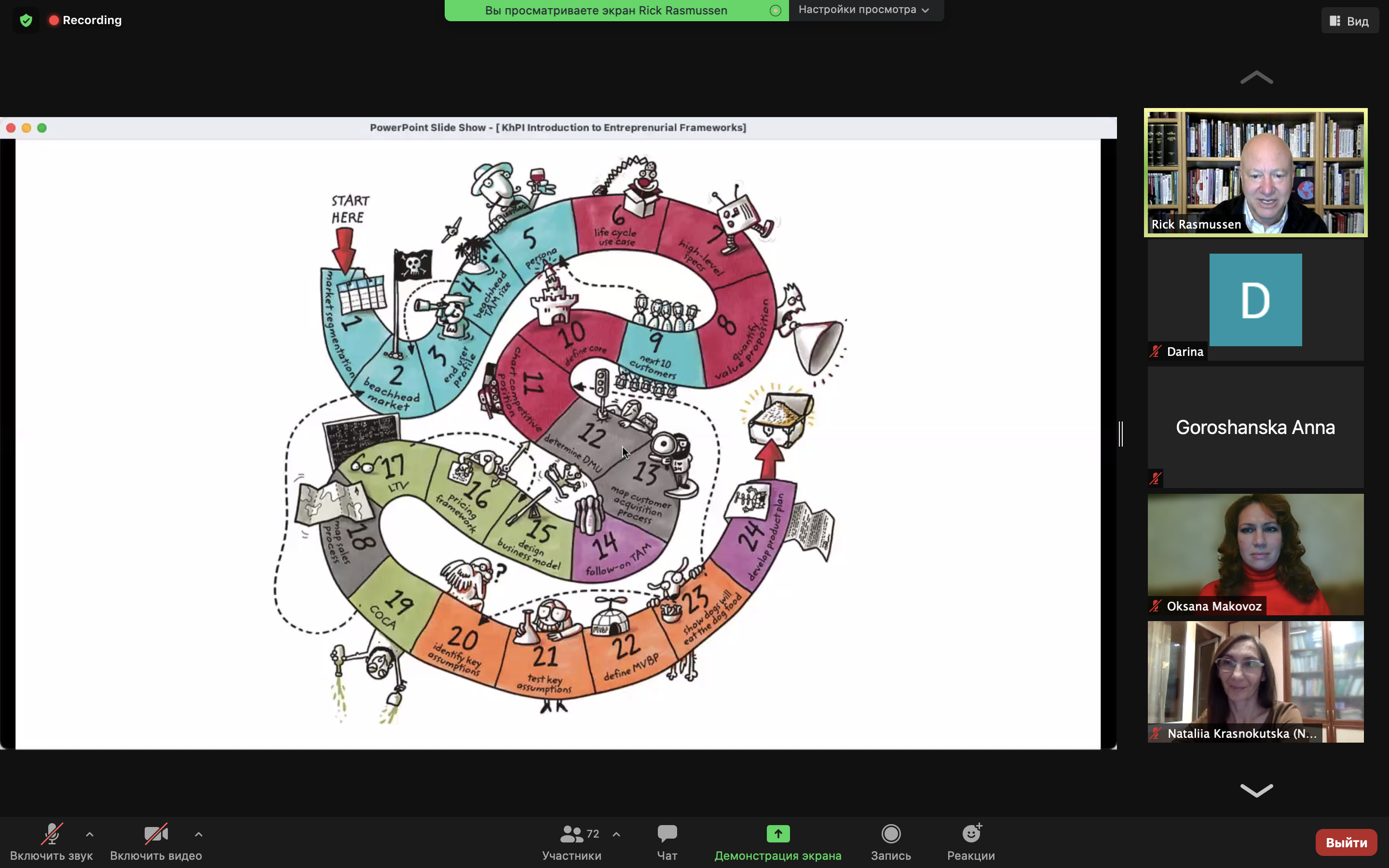 9 листопада о 16:00 Лектор Рік Расмуссен із Каліфорнійського університету Берклі (США) давав лекцiю на базi платформи Zoom. Тема першої лекції — «Introduction to Entrepreneurial Frameworks».Слухачі дізналися про використання на практиці кращих сучасних підходів до «розвитку споживача» (Customer Development) та так званого «дисциплінованого підприємництва» (Disciplined Entrepreneurship), а також історії їх виникнення