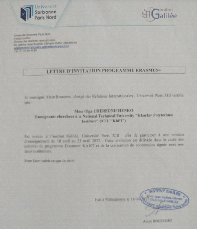 Olga Yuriivna was invited to be lecturer at the Sorbonne University Paris Nord (France),
