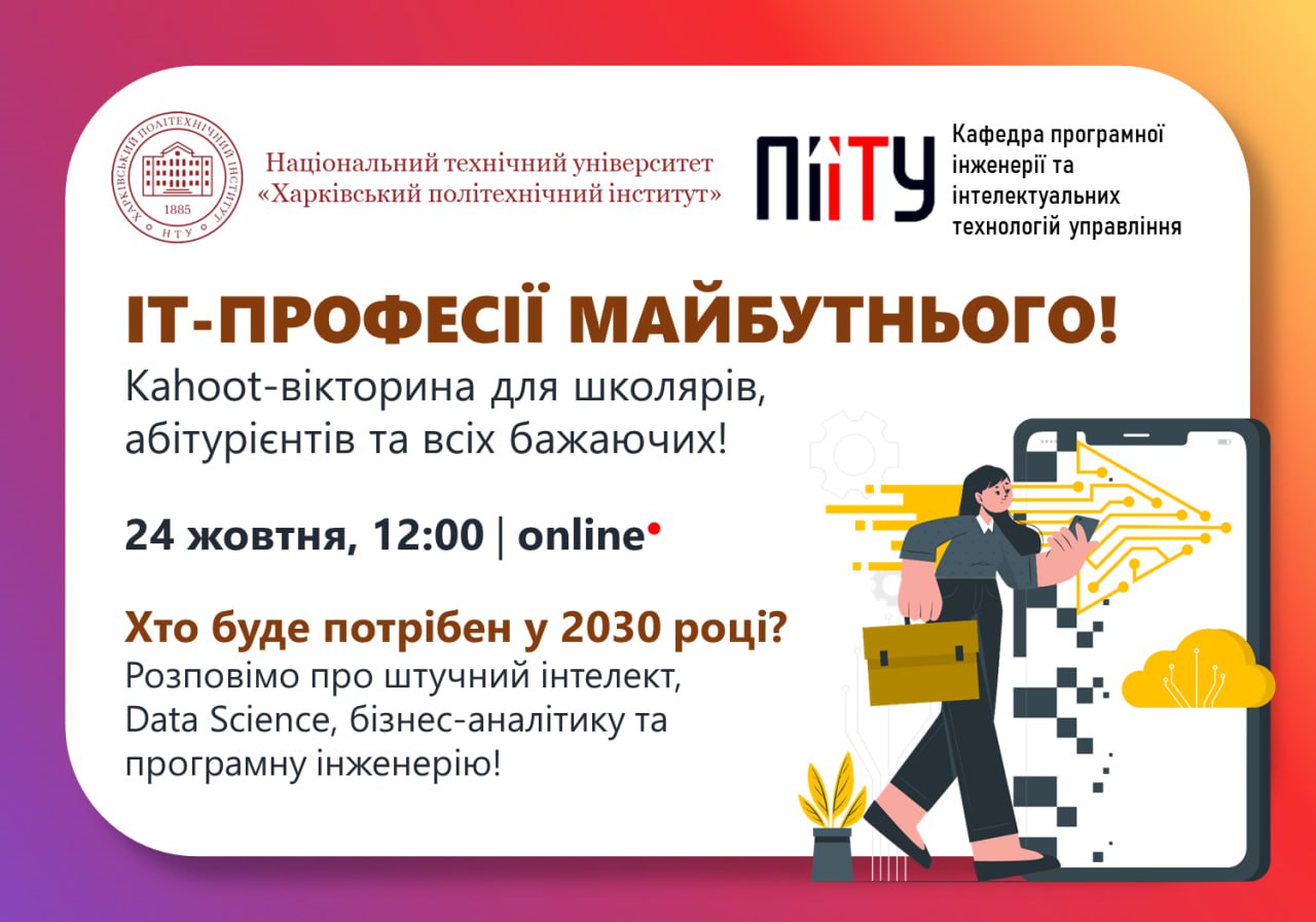 Бери друзів, приймай участь в заході “Осінні канікули з Політехом 2023”, грай в Kahoot-вікторину та дізнавайся подробиці разом з НТУ “ХПІ” та кафедрою “Програмна інженерія та інтелектуальні технології управління” (ПІІТУ)! ⬇️