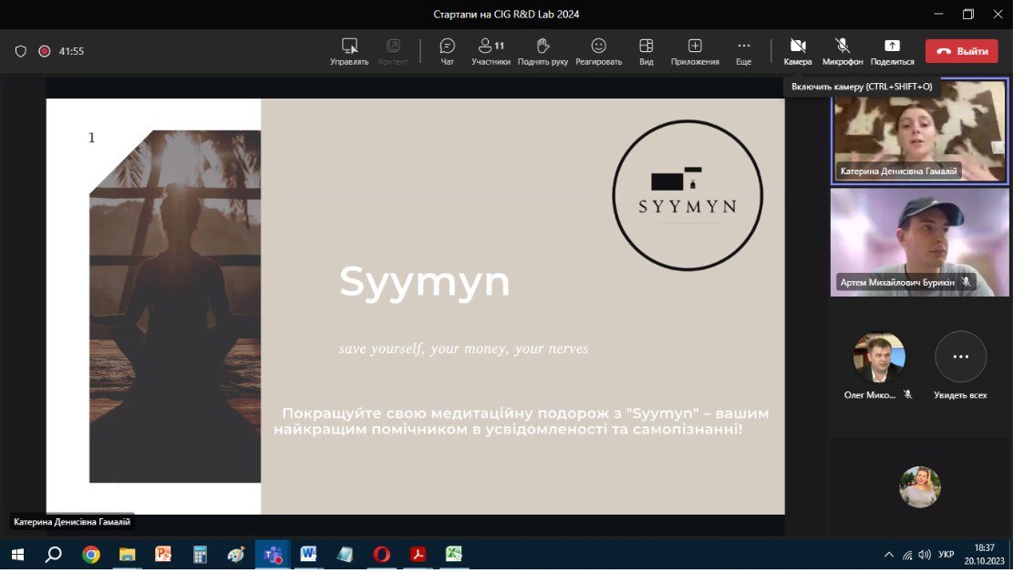 Команда Syymyn у складі Катерини Гамалій та Артема Бурикіна з групи КН-422с намагається вирішити конкретну проблему стресу та недостатнього психічного благополуччя у сучасному світі. Їх стартап надає інструменти та ресурси, що допомагають знизити рівень стресу, зосередитися, знайти внутрішню рівновагу та покращити загальний стан самопочуття. Ця технологія спрямована на позитивне впливання на психологічне благополуччя користувачів і допомагає забезпечити їм більш здоровий і збалансований спосіб життя.