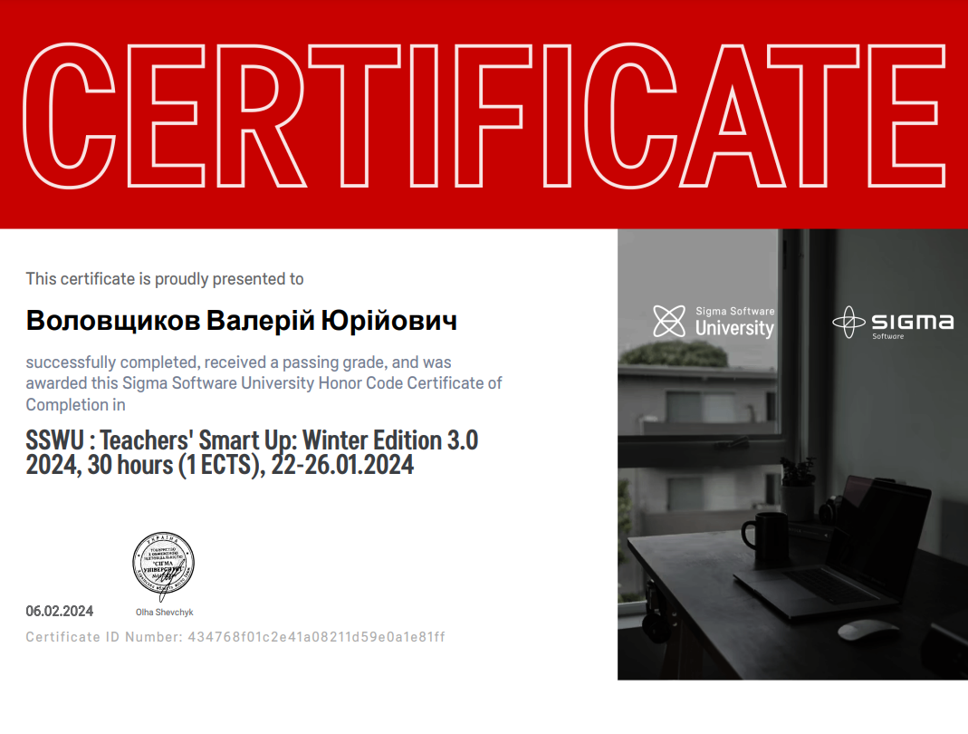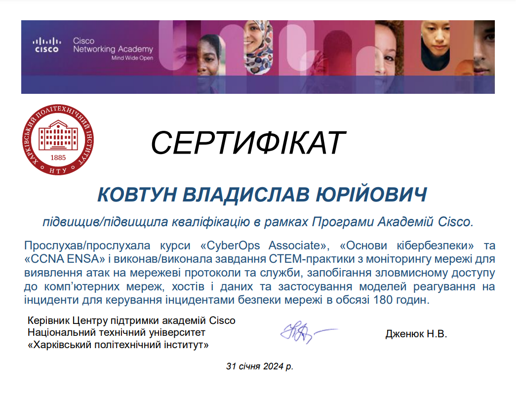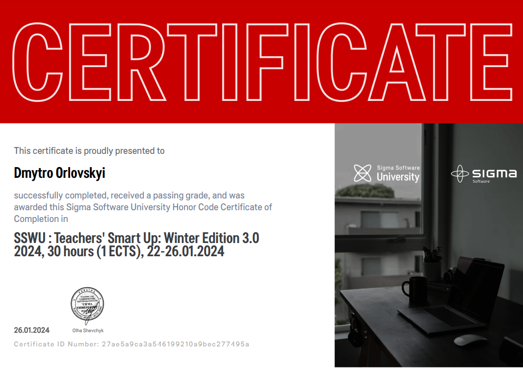 Associate professors Dmytro Orlovskyi, Valerii Volovshchykov, Vladyslav Kovtun, and senior lecturer Oksana Ivashchenko have recently completed advanced training courses at Sigma Software and Cisco Academy and will now be able to share with students the new experience gained in cooperation with IT specialists from these institutions.