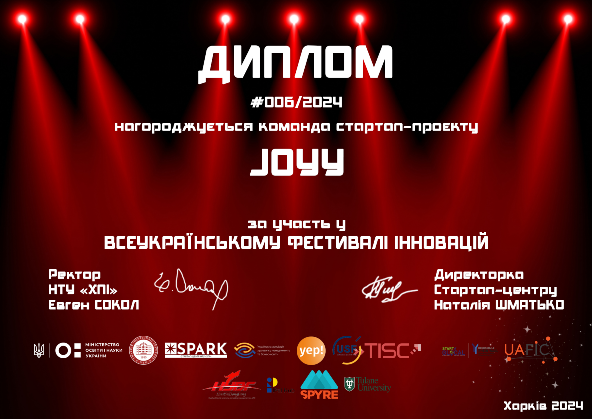✅ Проєкт “JOYY (JOURNEY OUTSIDE YOUR YARD)” розроблений студентами Валерієм Тітовим, Кирилом Орловським та Олексієм Петренком (група КН-221г) пропонує унікальний підхід до залучення відвідувачів місцевих закладів за допомогою інтерактивних завдань. Цей проєкт також включає аналіз конкурентного середовища, сприяючи розвитку малого та середнього бізнесу.