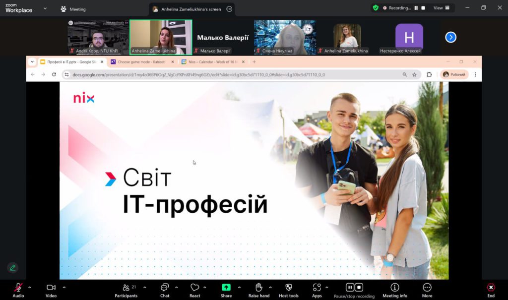19 листопада відбулася профорієнтаційна онлайн-зустріч для старшокласників, студентів коледжів, їхніх батьків та першокурсників ІТ-спеціальностей. Захід організували кафедри ПІІТУ, УПІТ та ІСТ ННІ КНІТ НТУ «ХПІ» спільно з ІТ-командою NIX.