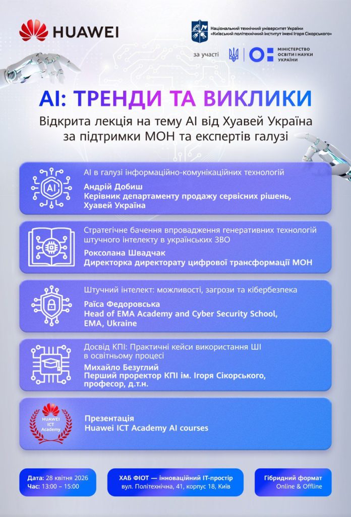 28 квітня 2026 року відбудеться відкрита лекція «AI: тренди та виклики», організована Huawei Україна за участі представників Міністерства освіти і науки України, КПІ та експертів галузі.