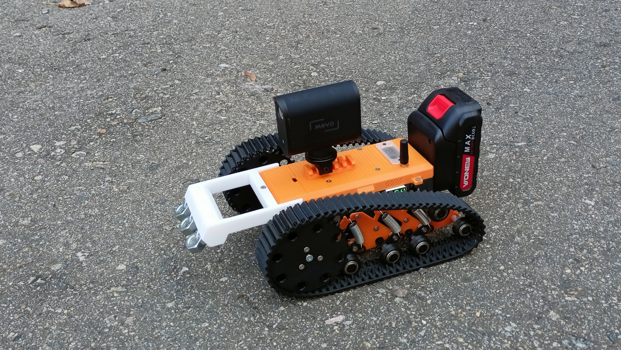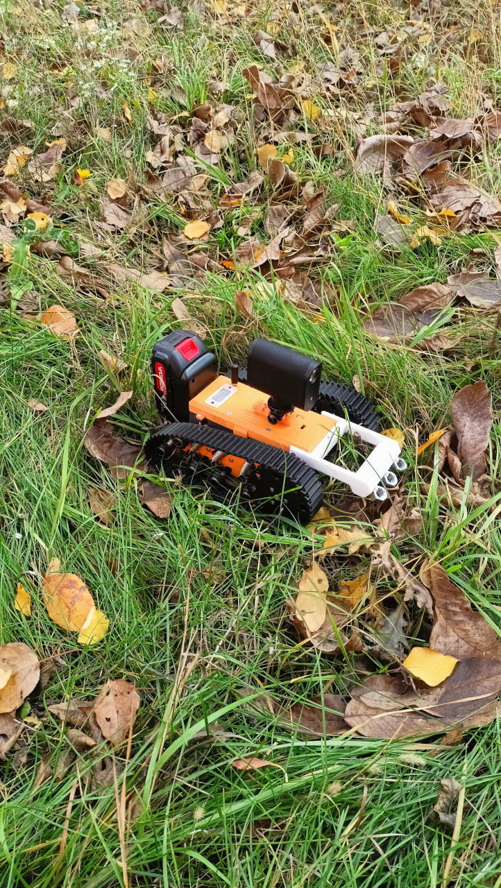 The platform we developed uses a tracked chassis, controlled wirelessly via the ESP-NOW protocol from a touch-screen console based on the ESP32 platform.