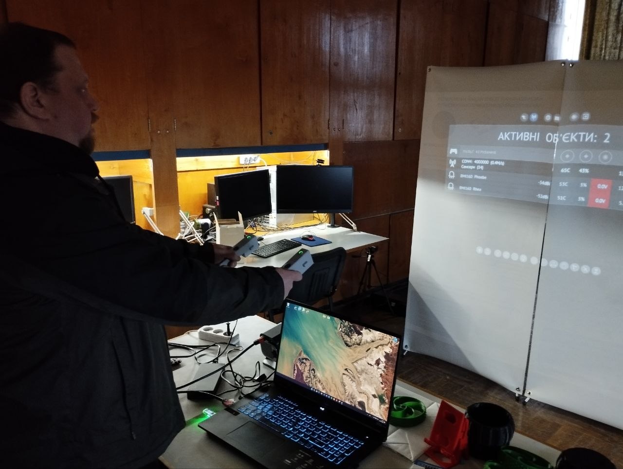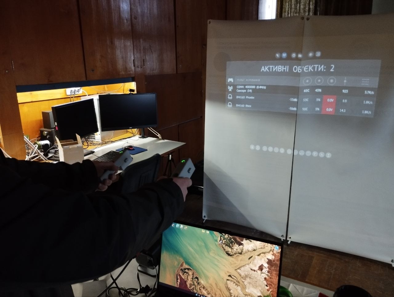 To facilitate testing and refinement, a specialized software suite with a virtual environment was developed. It enables system simulation, performance analysis, and optimization of control algorithms without the risk of damaging physical equipment. In addition to calibrating the manipulators, the system allows users to adapt to its controls through a small interactive game. In this training scenario, a spacecraft navigates through outer space, avoiding asteroids and hostile ships while collecting valuable resources, making the learning process both engaging and effective.