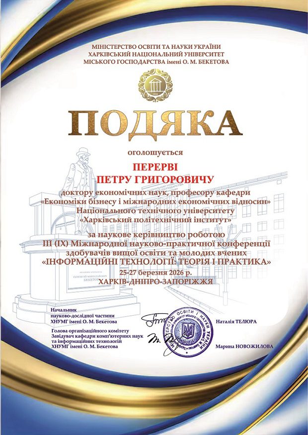 25-27 березня 2026 року відбулася ІІІ (ІХ) Міжнародна науково-практична конференція «ІНФОРМАЦІЙНІ ТЕХНОЛОГІЇ: ТЕОРІЯ І ПРАКТИКА». Он-лайн міст: «ХАРКІВ-ДНІПРО-ЗАПОРІЖЖЯ», наукове керівництво роботою якої здійснював д.е.н., професор Перерва Петро Григорович. Організатори наукової міжнародної конференції відзначили наукову роботу і внесок в організацію роботи конференції Перерви Петра Григоровича подякою (JPG).