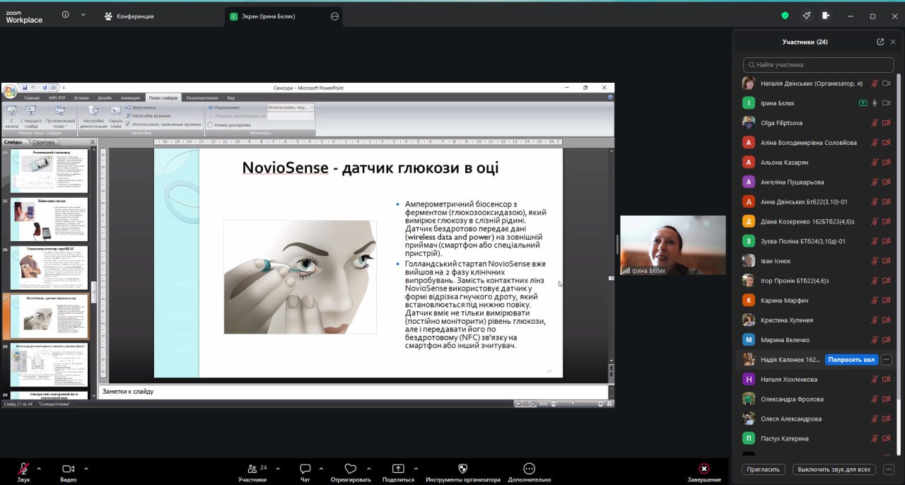 On April 3, 2026, Associate Professor of the Department of Biotechnology, Biophysics and Analytical Chemistry, Iryna Anatoliivna Bielykh, delivered a guest lecture at the National University of Pharmacy on the topic: “Introduction to Biosensors. General Characteristics of Biological and Chemical Sensor Systems.”
