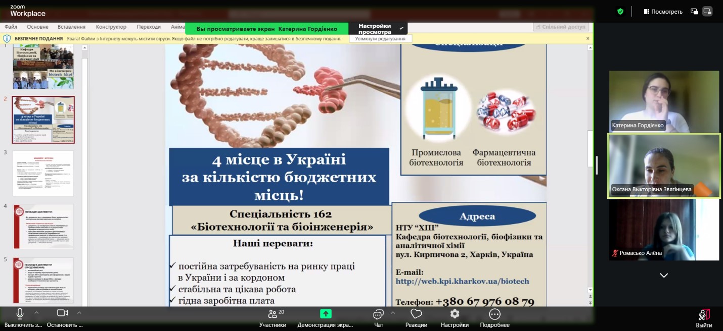 Питання, що розглядалися: Характеристика спеціальності та освітньої програми «Біотехнології та біоінженерія» в НТУ «ХПІ». Знайомство майбутніх абітурієнтів з промисловими біотехнологіями виробництва харчових продуктів та напоїв бродіння