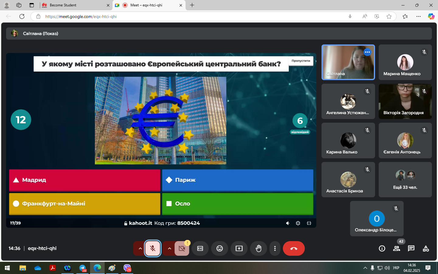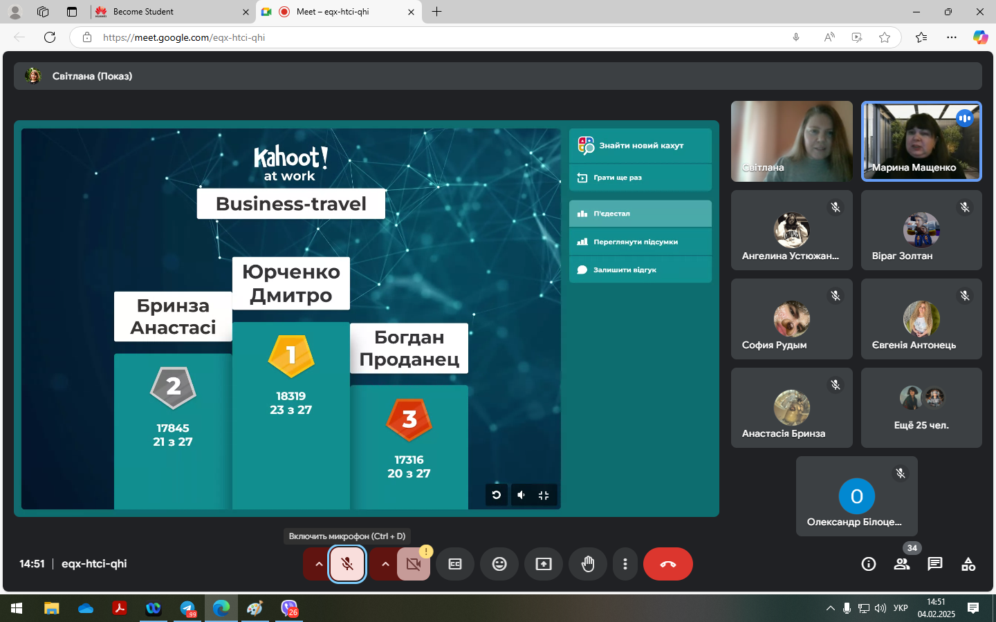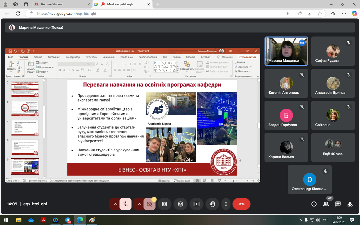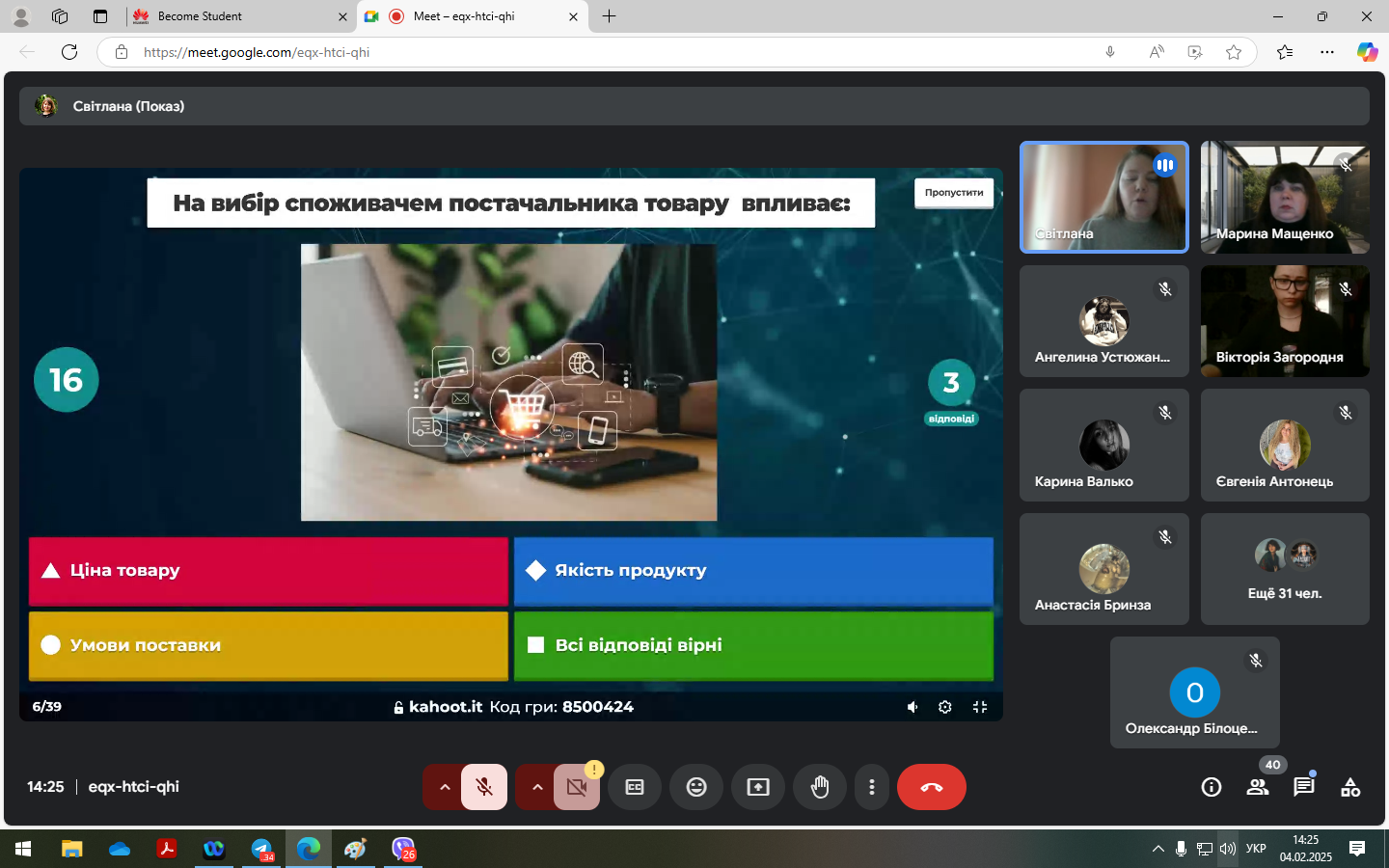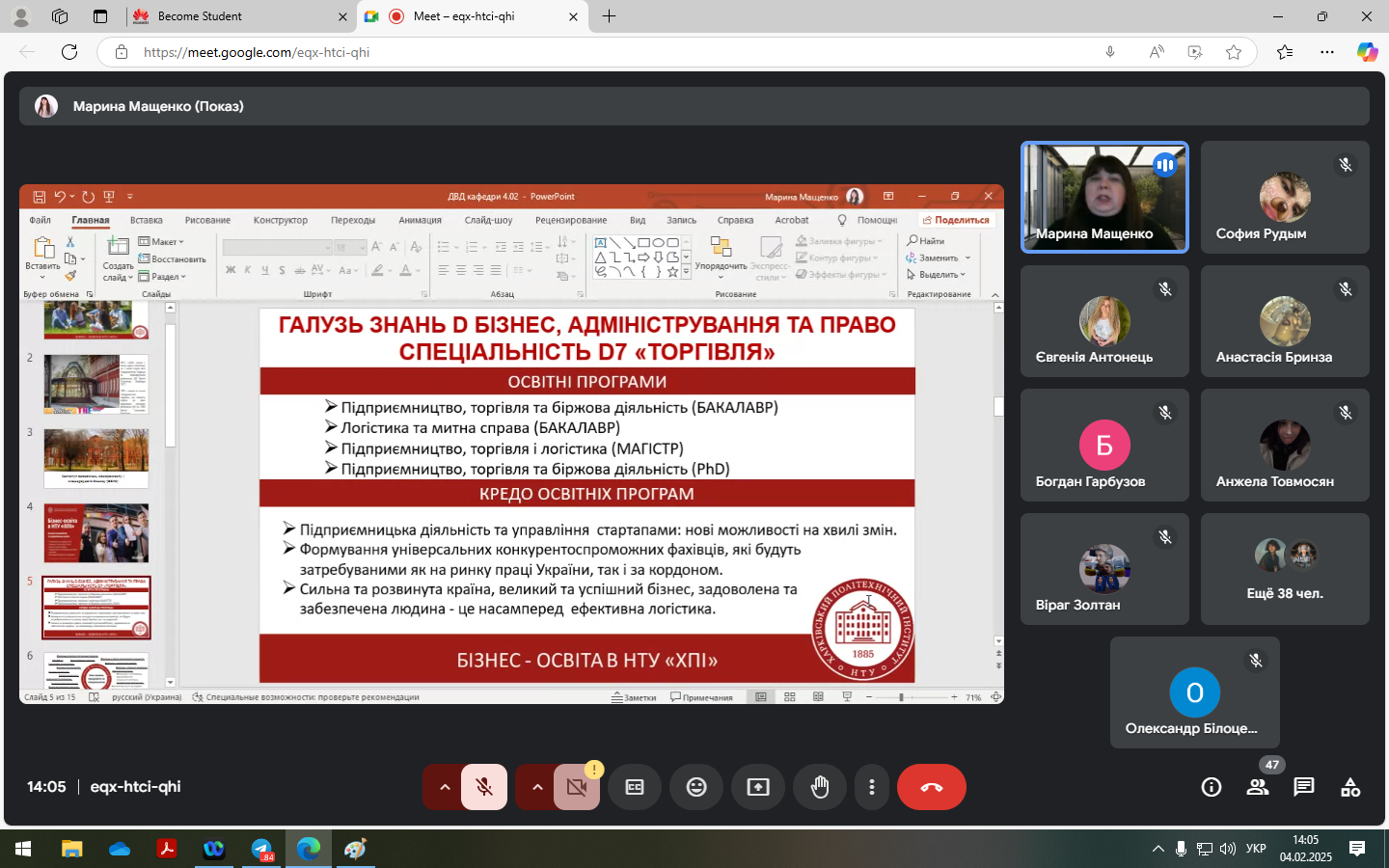 4 лютого 2025 року кафедра підприємництва, торгівлі і логістики НТУ «ХПІ» провела профорієнтаційний захід, де завідувач кафедри, д.е.н., професор Марина Мащенко презентувала освітні програми кафедри: “Підприємництво, торгівля та біржова діяльність, «Логістика та митна справа», «Підприємництво, торгівля і логістика» та акцентувала увагу майбутніх студентів, що спеціальність D7 «Торгівля» охоплює сучасні підходи до ведення бізнесу, організації торговельної діяльності та управління логістичними процесами. Ведучий доцент кафедри к.е.н., Світлана Степуріна провела гру-kahoot “Business Travel”, де всі учасники заходу прийняли активну участь, а переможцями стали Дмитро Юрченко (І місце), Анастасія Бринза (ІІ місце) та Богдан Проданец (ІІІ місце).
