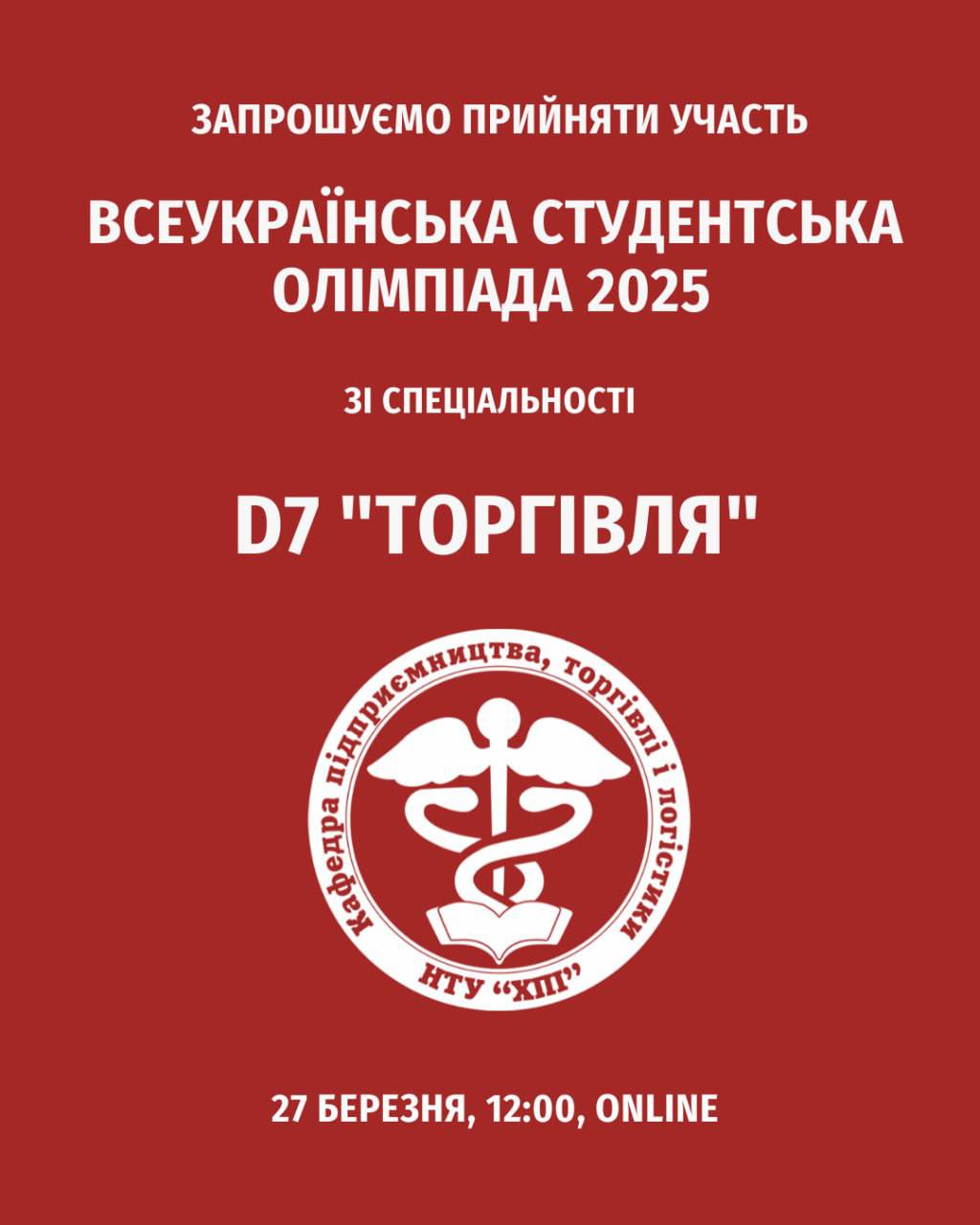 📣 Шановні студенти! Запрошуємо Вас до участі у І турі Всеукраїнської студентської олімпіади 🏆 2025 р. зі спеціальності: D7 «Торгівля» (076 “Підприємництво та торгівля”), що проводить кафедра Підприємництва, торгівлі і логістики Національного технічного університету “Харківський політехнічний інститут”, яка відбудеться 27 березня о 12.00 (за Київським часом) в Online форматі.
