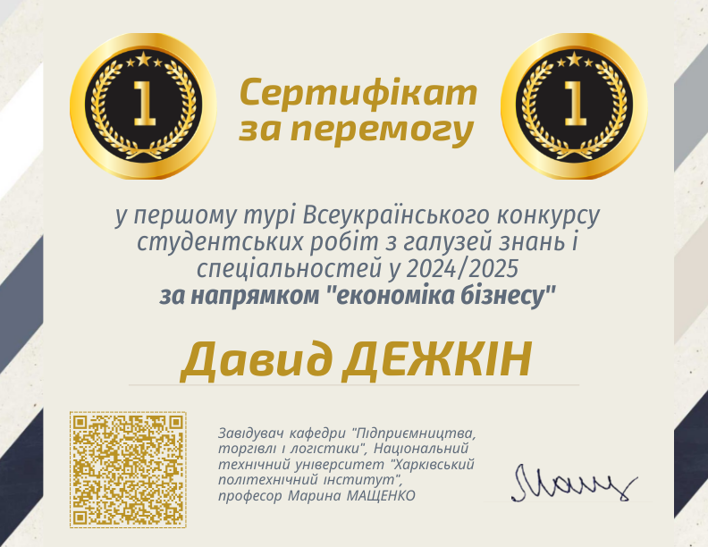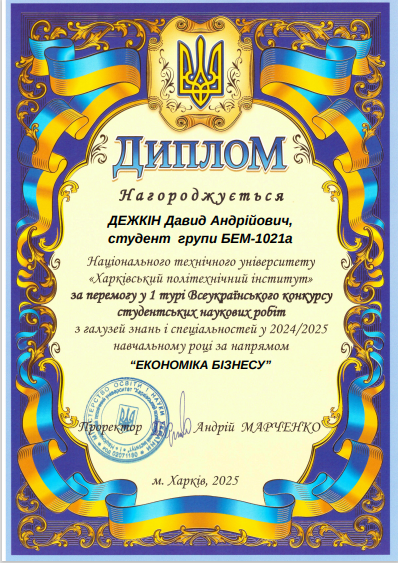 - Дежкіна Давида за напрямком економіка бізнесу (науковий керівник к.е.н., доцент Іпполітова І.Я.),