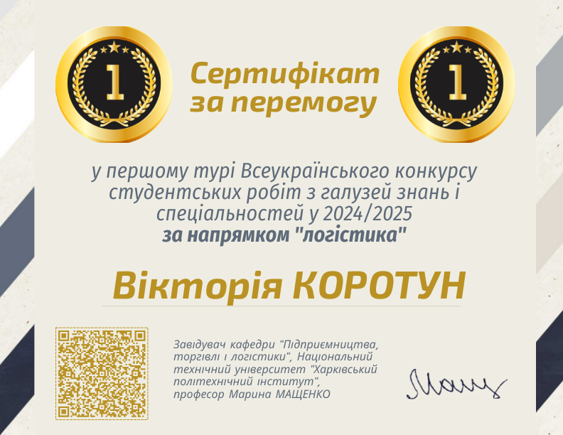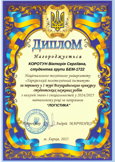 - Коротун Вікторію за напрямком логістика (науковий керівник д.е.н., проф. Сисоєв В.В.)