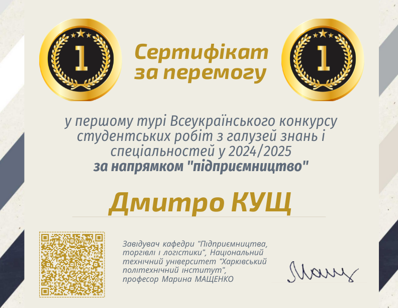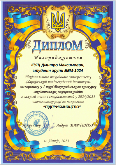 - Куща Дмитра за напрямком підприємництво (науковий керівник д.е.н., проф. Мащенко М.А.),