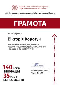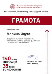 Щиро вітаємо студентів спеціальності «Підприємництво та торгівля» освітніх програм «Логістика та митна справа», «Підприємництво, торгівля і логістика», «Підприємництво, торгівля та біржова діяльність» — Вікторію Коротун, Марину Яцуту та Дмитра Рилова — з отриманням грамоти Національного технічного університету «Харківський політехнічний інститут» з нагоди 140-річчя НТУ «ХПІ».