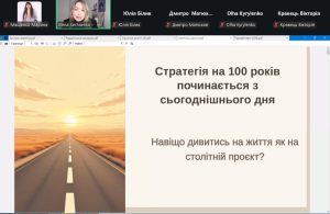 - проф. Олена Сергієнко представила доповідь «Стратегія на 100 років починається з сьогоднішнього дня: навіщо дивитися на життя як на столітній проєкт?», у якій було акцентовано увагу на розвитку стратегічного мислення як важливої складової професійного становлення сучасного фахівця.