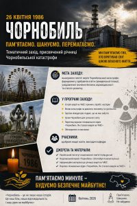 У межах заходу здобувачі освіти ознайомилися з історичними фактами аварії на Чорнобильській атомній електростанції 26 квітня 1986 року, її масштабними екологічними, соціально-економічними та гуманітарними наслідками, а також із героїзмом ліквідаторів, які ціною власного життя і здоров’я зупинили поширення катастрофи. Особливу увагу було приділено питанням відповідальності суспільства за техногенну безпеку, формуванню культури ризик-менеджменту та важливості сталого розвитку в сучасних умовах.
