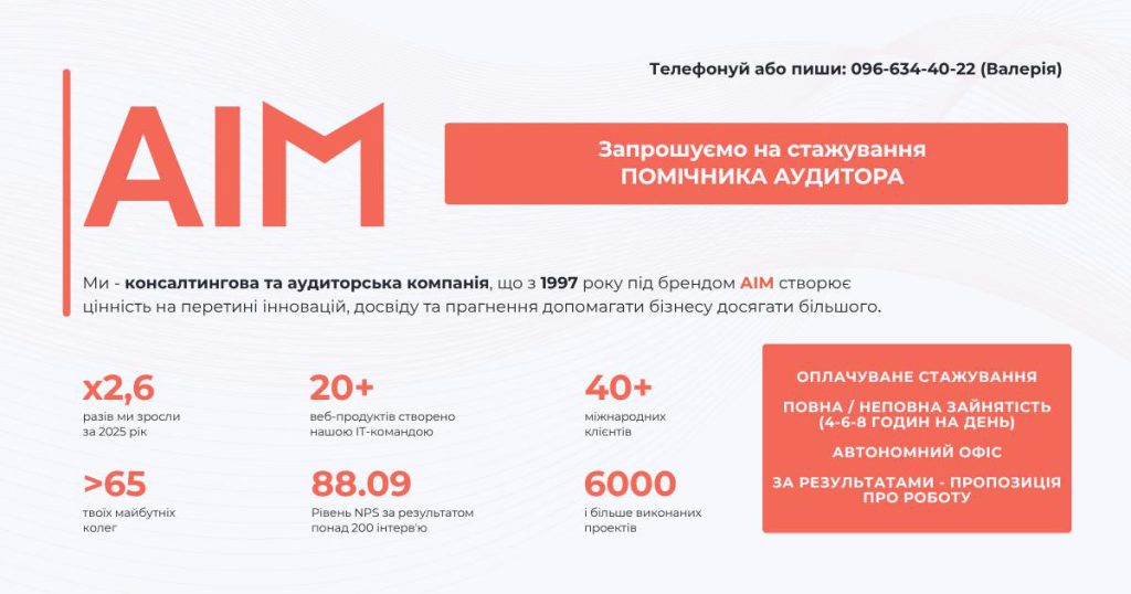 Помічник аудитора — консалтингова та аудиторська компанія АІМ запрошує на оплачуване стажування або постійну співпрацю.