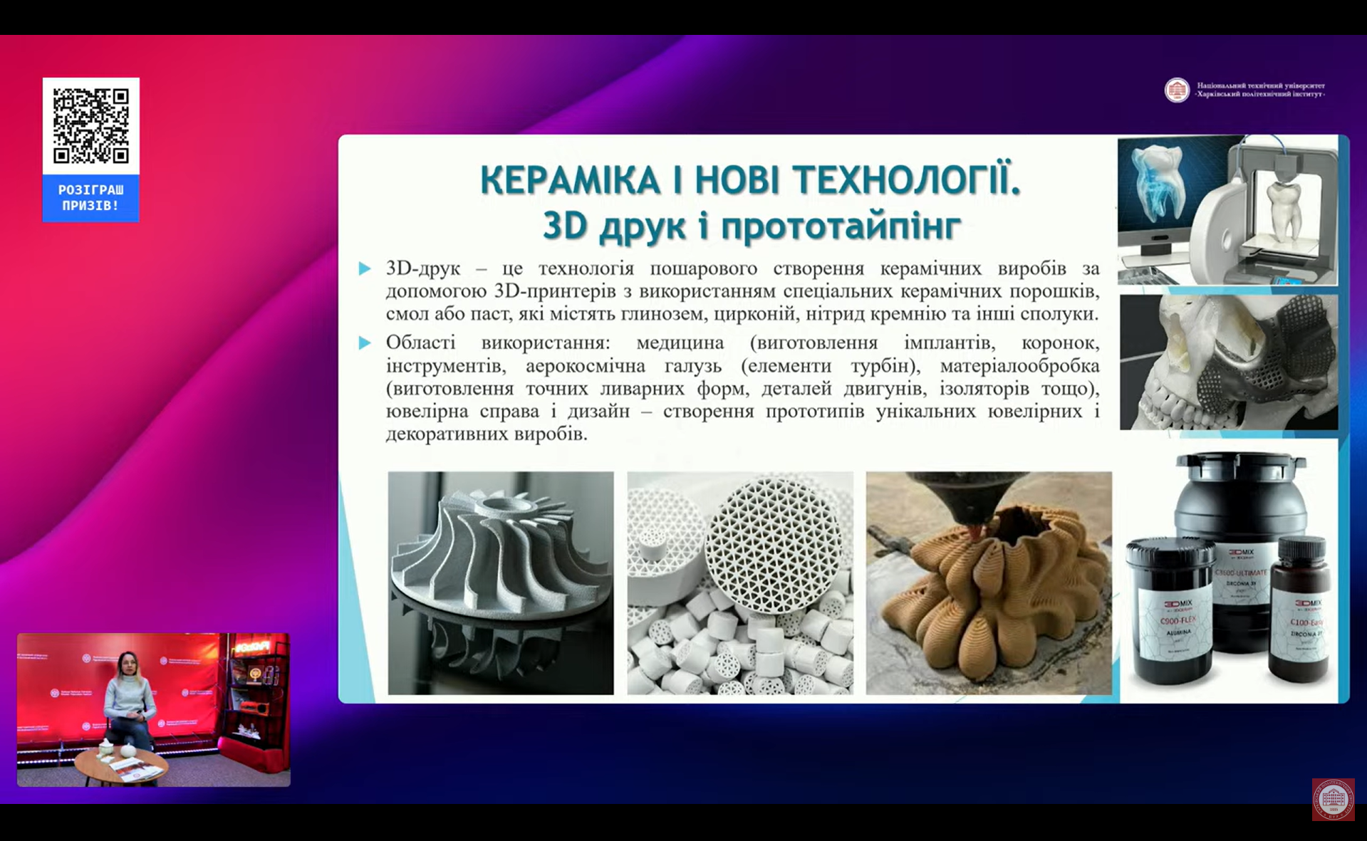 Захід відбувся у межах осіннього онлайн-проєкту «Канікули з Політехом: 140 років інновацій – святкуємо ювілей НТУ «ХПІ». Під час лекції учасники дізналися про еволюцію керамічних матеріалів – від давніх глиняних виробів до сучасних високотехнологічних керамік, що використовуються в авіації, медицині та космічній техніці.