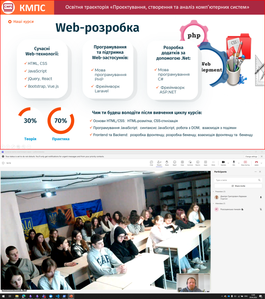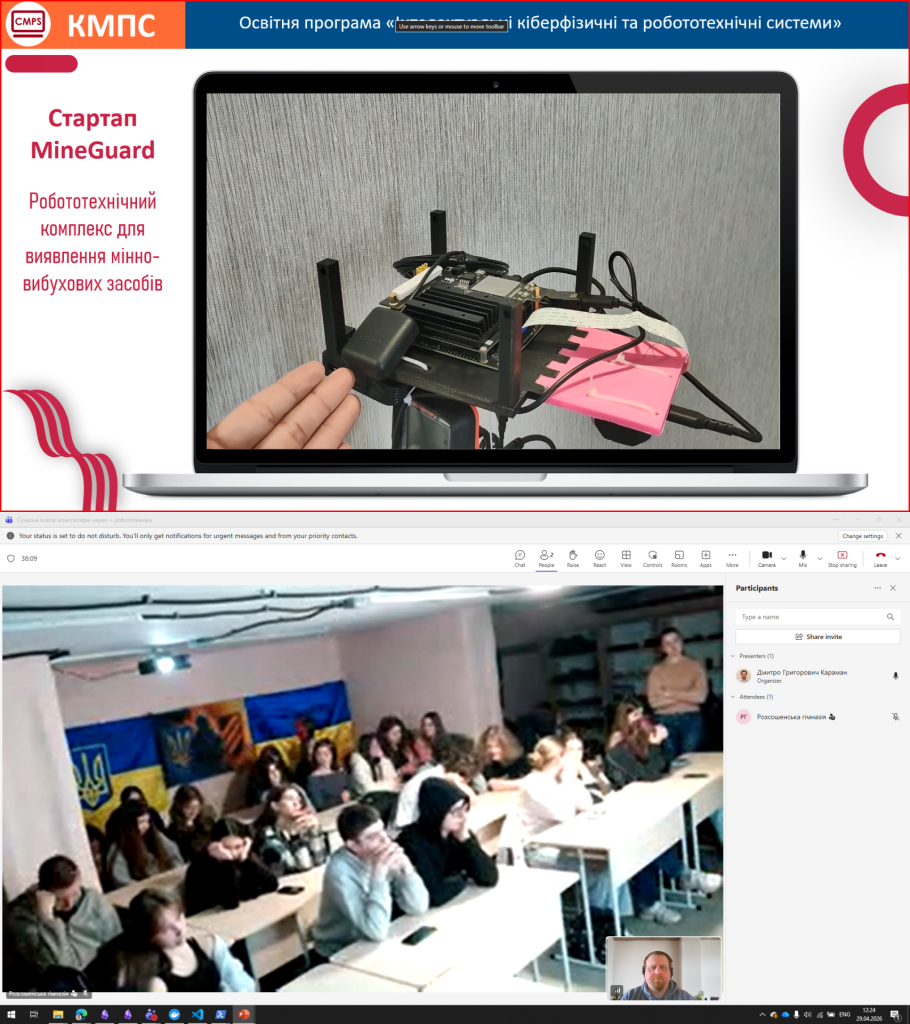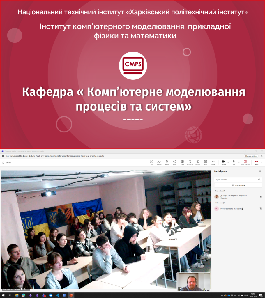 Dmytro Karaman, Senior Lecturer in the Department of Computer Modeling of Processes and Systems, held a career guidance session with students at the Rossoshenska Gymnasium in Poltava Oblast. The event was dedicated to introducing students to modern IT fields and opportunities for pursuing education in computer science and robotics 🚀💻