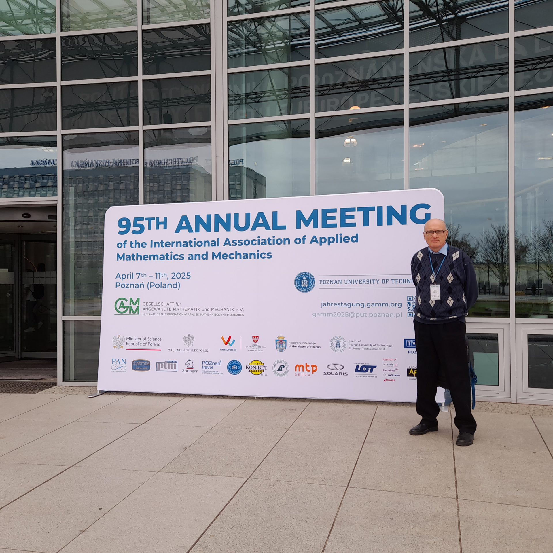Professors and postgraduate students of the department (Prof. D. Breslavsky, Assoc. Prof. O. Tatarinova, M. Borodin, P. Palamarchuk) based on the results of research under the NATO program “Science for Peace and Security” presented a scientific report at the 95th Annual Meeting of the International Association of Applied Mathematics and Mechanics, which was held in Poznan (Poland) on April 7-11, 2025. Prof. D. Breslavsky delivered a report at the conference, which presented the results on the evaluation of strength, vibrations, and impact loading of aircraft structural panels made of metamaterials. Such results were obtained by the scientific team in creative collaboration with Professors H. Altenbach and F. Pellicano from the Universities of Magdeburg (Germany) and Modena (Italy).