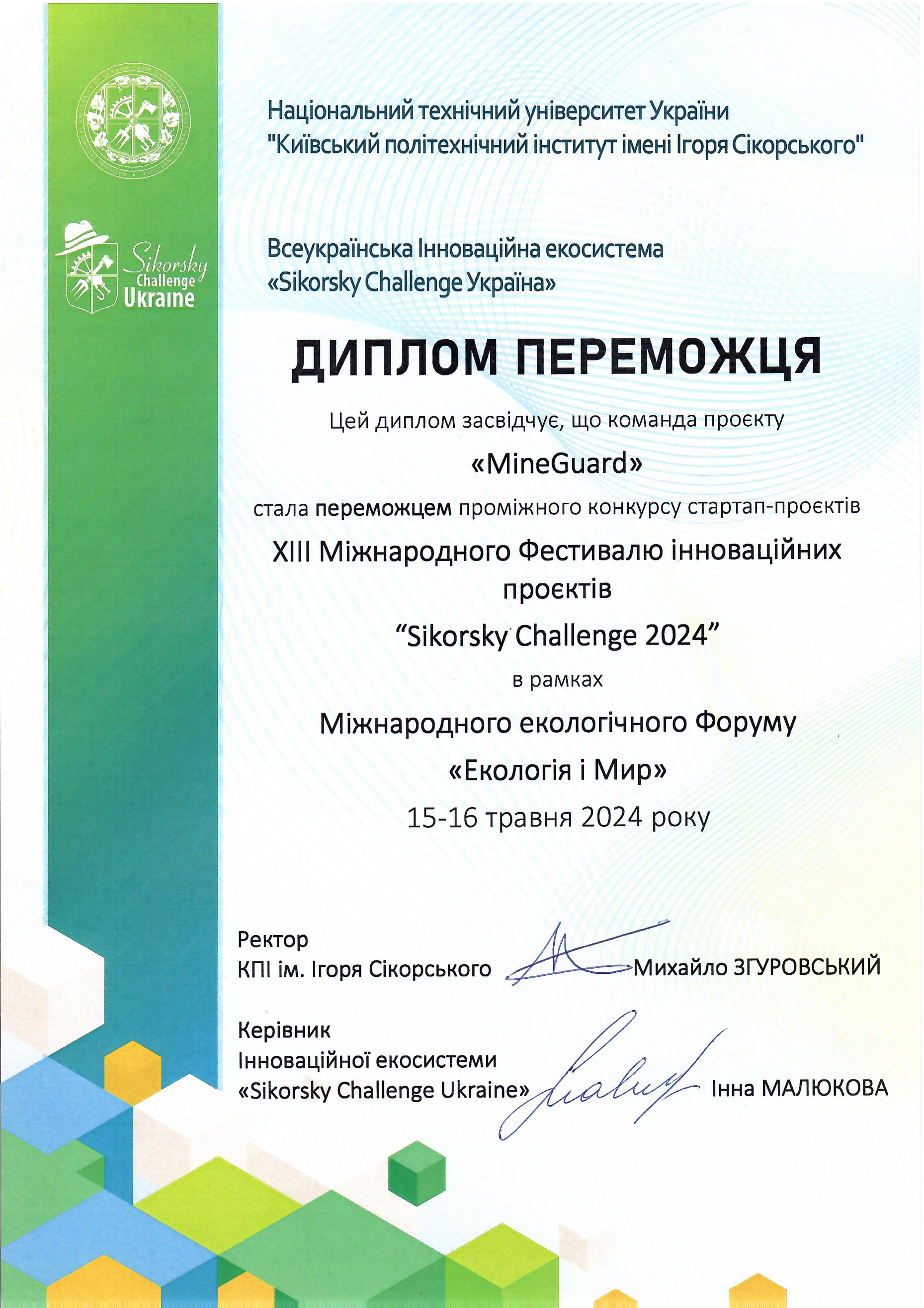Команда стартапу «MineGuard. Передова система виявлення мін» отримала перемогу на проміжному конкурсі стартап проєктів XIII Міжнародного Фестивалю інноваційних проєктів «Sikorsky Challenge 2024» в рамках Міжнародного екологічного Форуму «Екологія і Мир» 15-16 травня 2024 року. Переможці автоматично стають фіналістами XIII Міжнародного Фестивалю “Sikorsky Challenge 2024”, який відбудеться вже у кінці жовтня цього року. Також команді надається право безоплатно пройти акселераційну програму від Інноваційного Холдингу “Sikorsky Challenge”, з метою підготовки проєктів до інвестування.