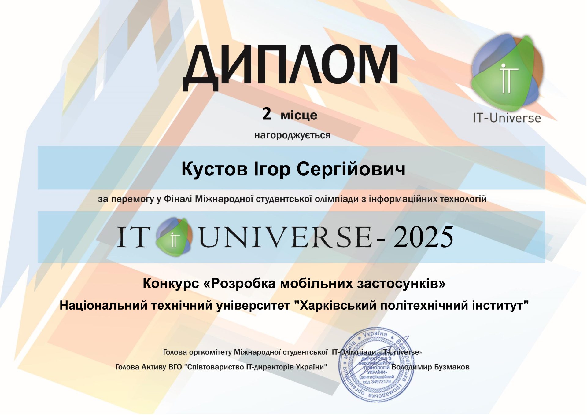 🎉Студенти кафедри комп’ютерного моделювання процесів та систем Кустов Ігор та Кустов Вадим посіли друге місце місце у конкурсі «Розробка мобільних застосунків» в фіналі міжнародної студентської олімпіади з інформаційних технологій IT Universe 2025 з проєктом “CustomFit — мобільний фітнес-додаток”. Наукова керівниця – доцент кафедри КМПС Марія Некрасова. Вітаємо з перемогою!
