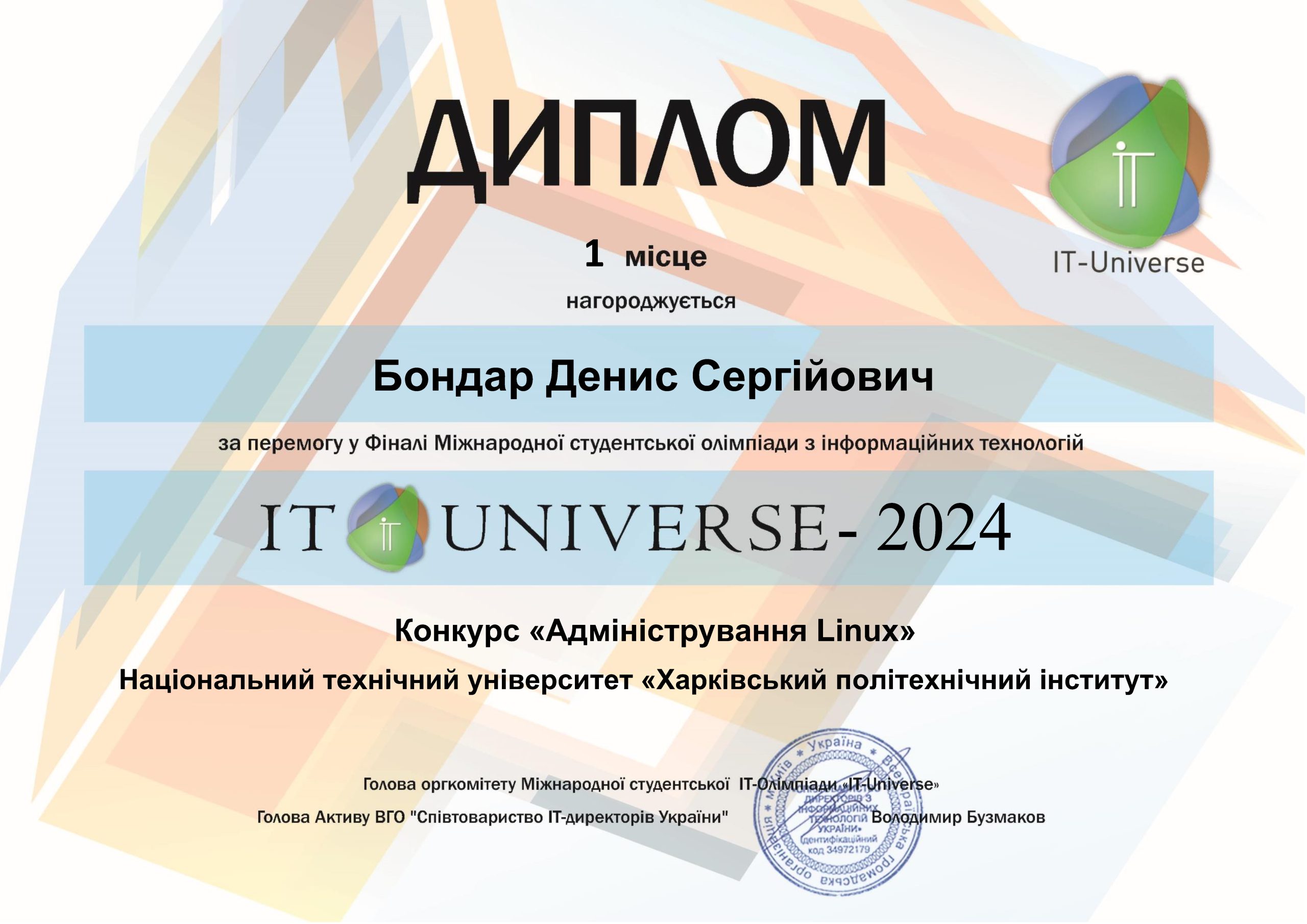 🎉Денис Бондар, студент гр. ІКМ-М223д кафедри комп’ютерного моделювання процесів та систем, цього року посів перше місце у конкурсі «Адміністрування Linux» в олімпіаді IT Universe. Переможець має отримати сертифікат на 5000 грн в Comfy. Вітаємо Дениса з перемогою!