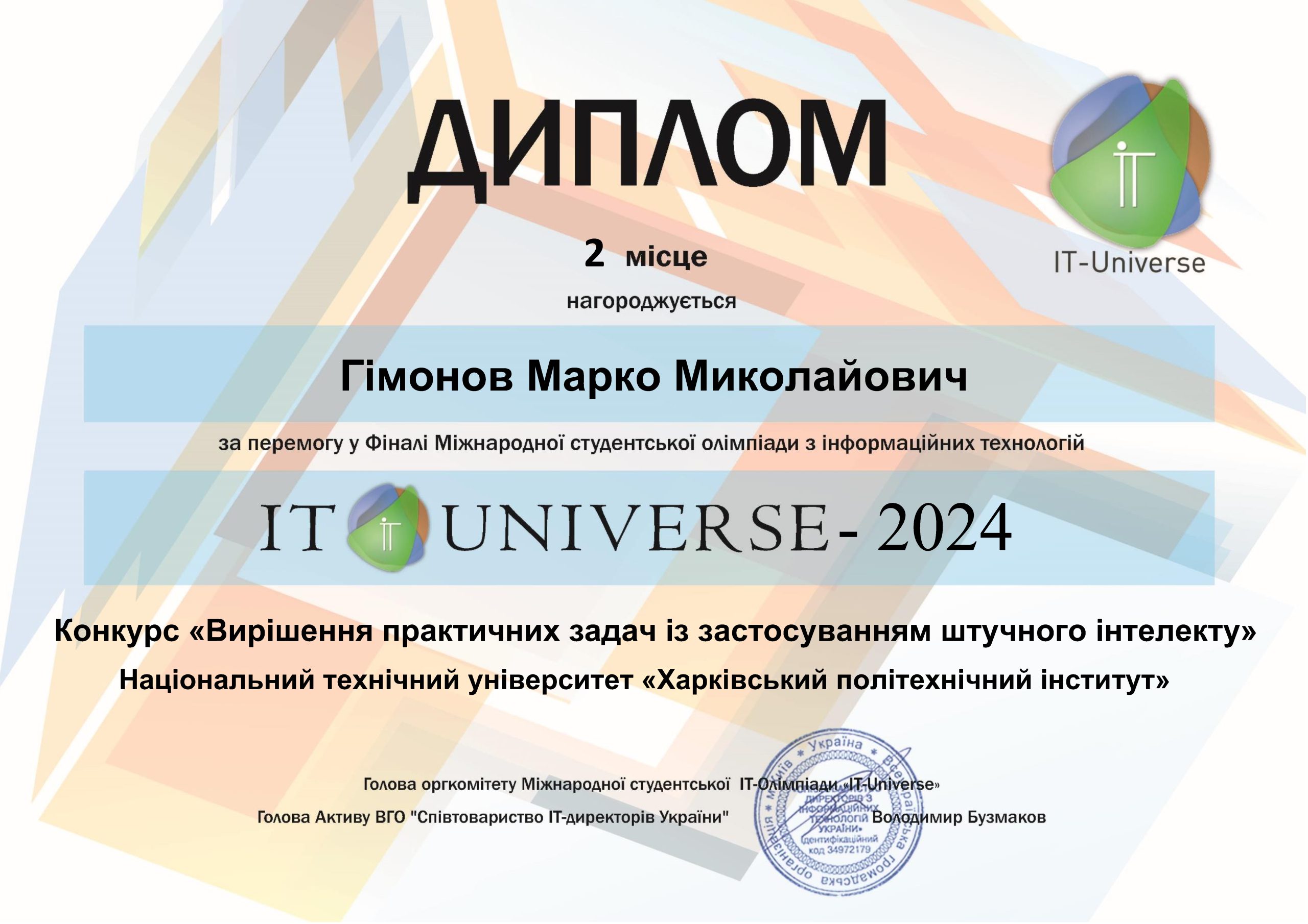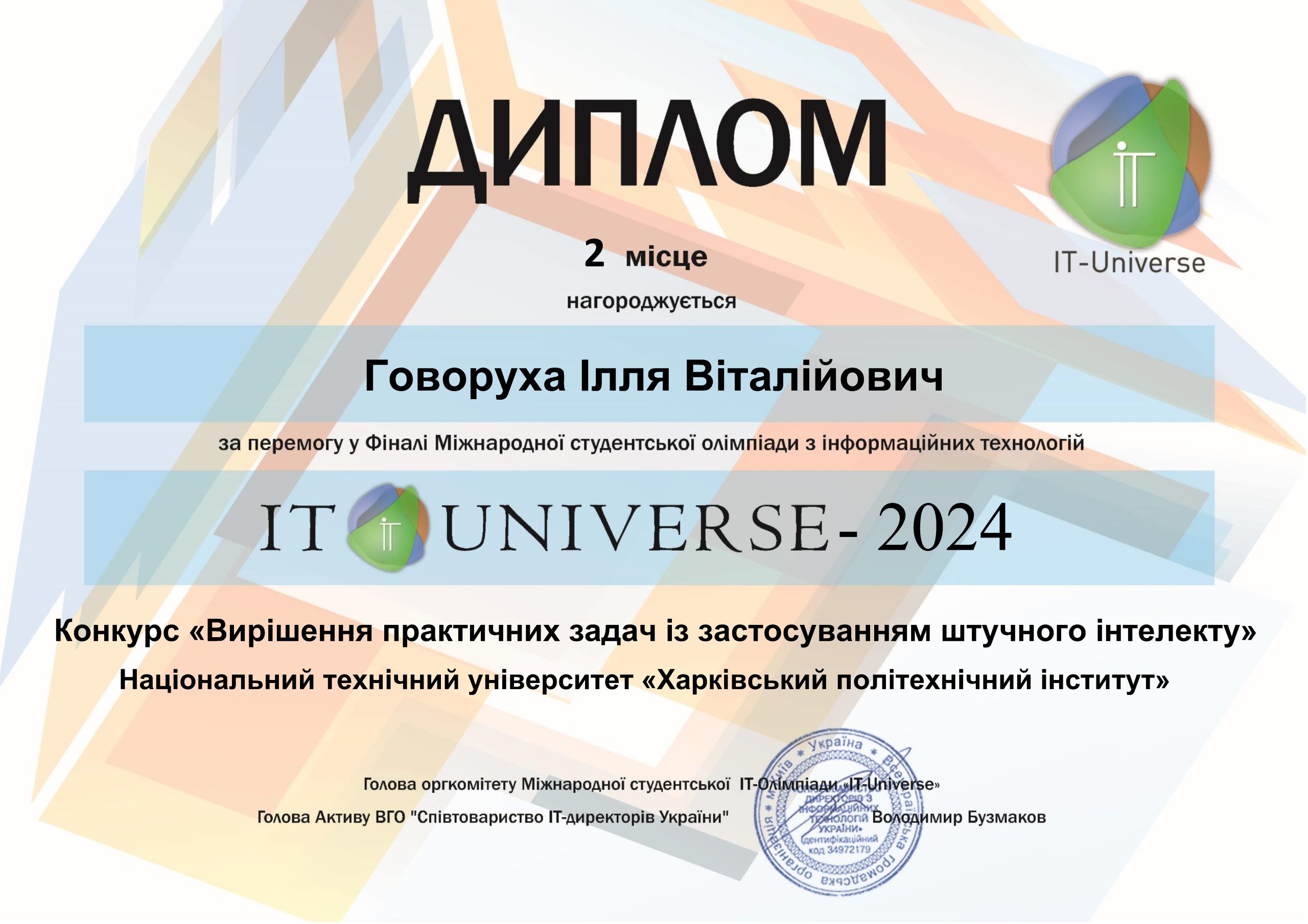 🎉Команда зі студентів Марка Гімонова, студента гр. ІКМ-220а кафедри КМПС, та студента Іллі Говорухи, студента гр. ІКМ-120 кафедри ММІ, посіла друге місце у конкурсі «Вирішення практичних задач із застосуванням штучного інтелекту» з проєктом «Розробка системи виявлення та класифікації наземних вибухонебезпечних предметів за допомогою машинного навчання» в олімпіаді IT Universe. Переможці мають отримати сертифікат на 2000 грн в Comfy. Вітаємо з перемогою!