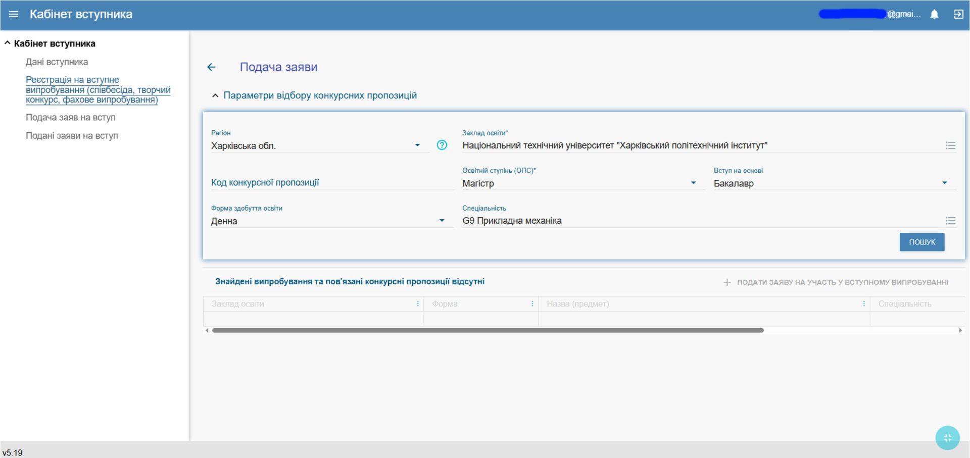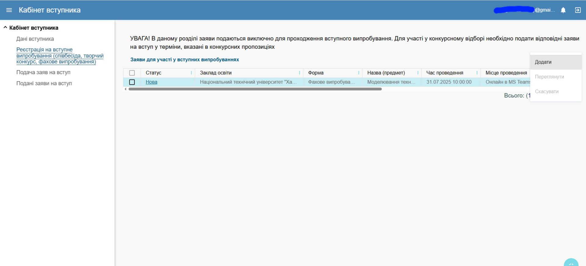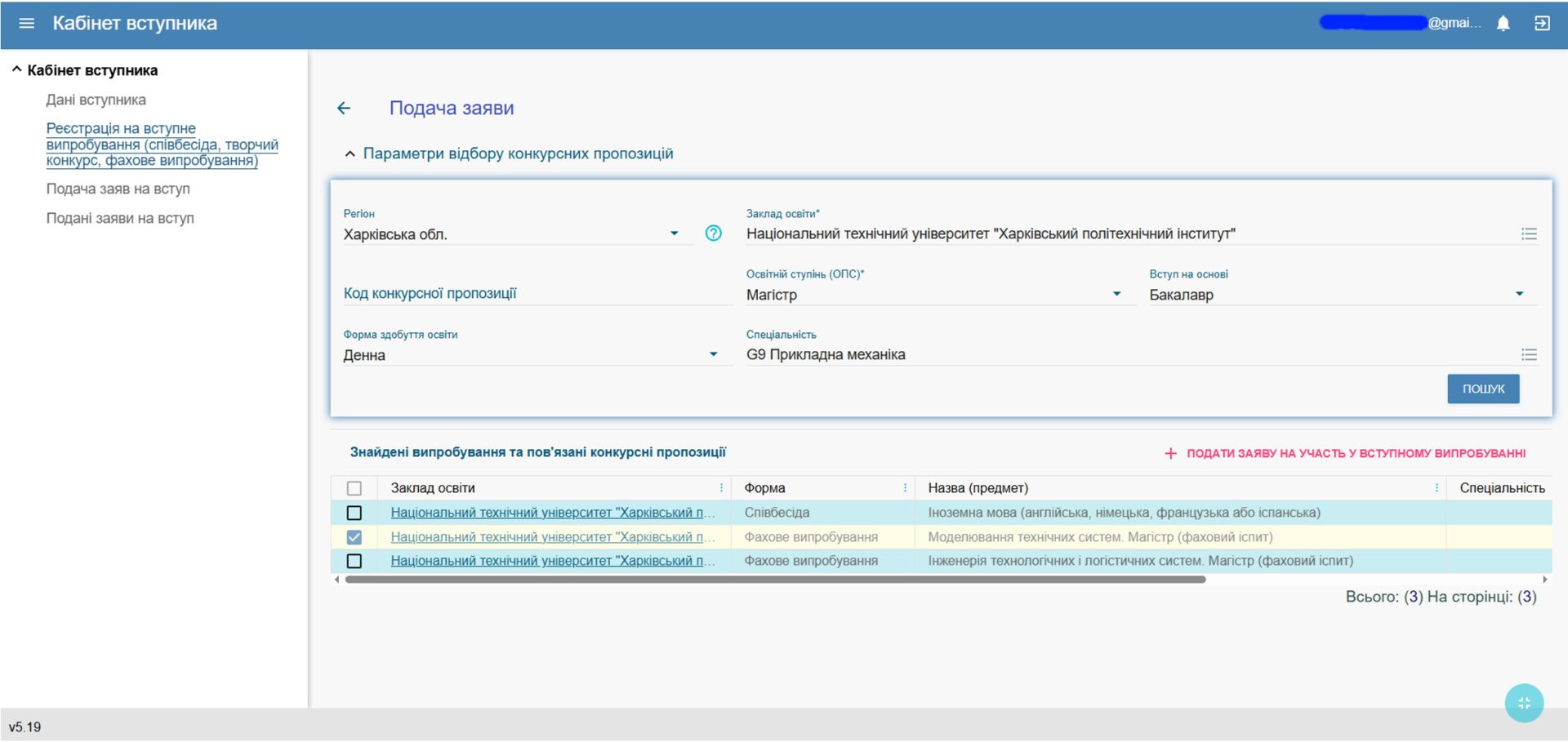 - Після введення даних натиснути “ПОШУК”. З’явиться перелік випробувань. У переліку випробувань треба обрати (позначити «галочкою») те, де у стовпці «Назва (предмет)» вказано «Моделювання технічних систем». Далі натискаємо рядок «+Подати заяву на участь у вступному випробуванні»